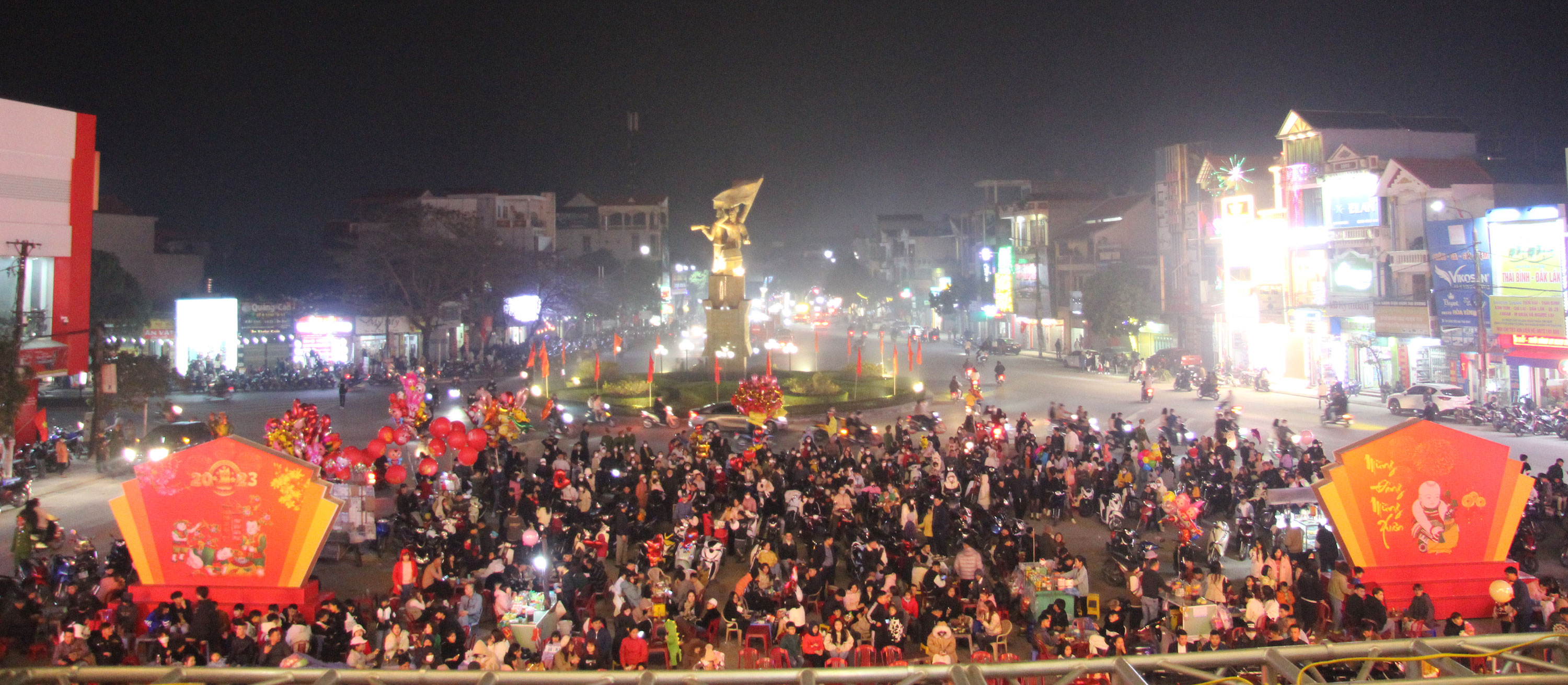 Khu vực trung tâm huyện Kiến Xương được trang hoàng lộng lẫy với nhiều cờ hoa, pano và đèn trang trí lung linh sắc màu. Tại Trung tâm Văn hóa - Thể thao huyện diễn ra chương trình nghệ thuật mừng Đảng, mừng xuân Quý Mão 2023 với nhiều tiết mục đặc sắc ca ngợi Đảng, Bác Hồ, tình yêu quê hương đất nước. Ngay cạnh đó là điểm bắn pháo hoa của huyện nên lượng người từ các ngả đường đổ về trung tâm thị trấn mỗi lúc một đông hơn. Năm nay người dân đã được thỏa mãn sở thích đi chơi tối giao thừa, du xuân ngay trong những thời khắc đẹp nhất của năm mới sau nhiều năm phải ở nhà do dịch Covid-19.