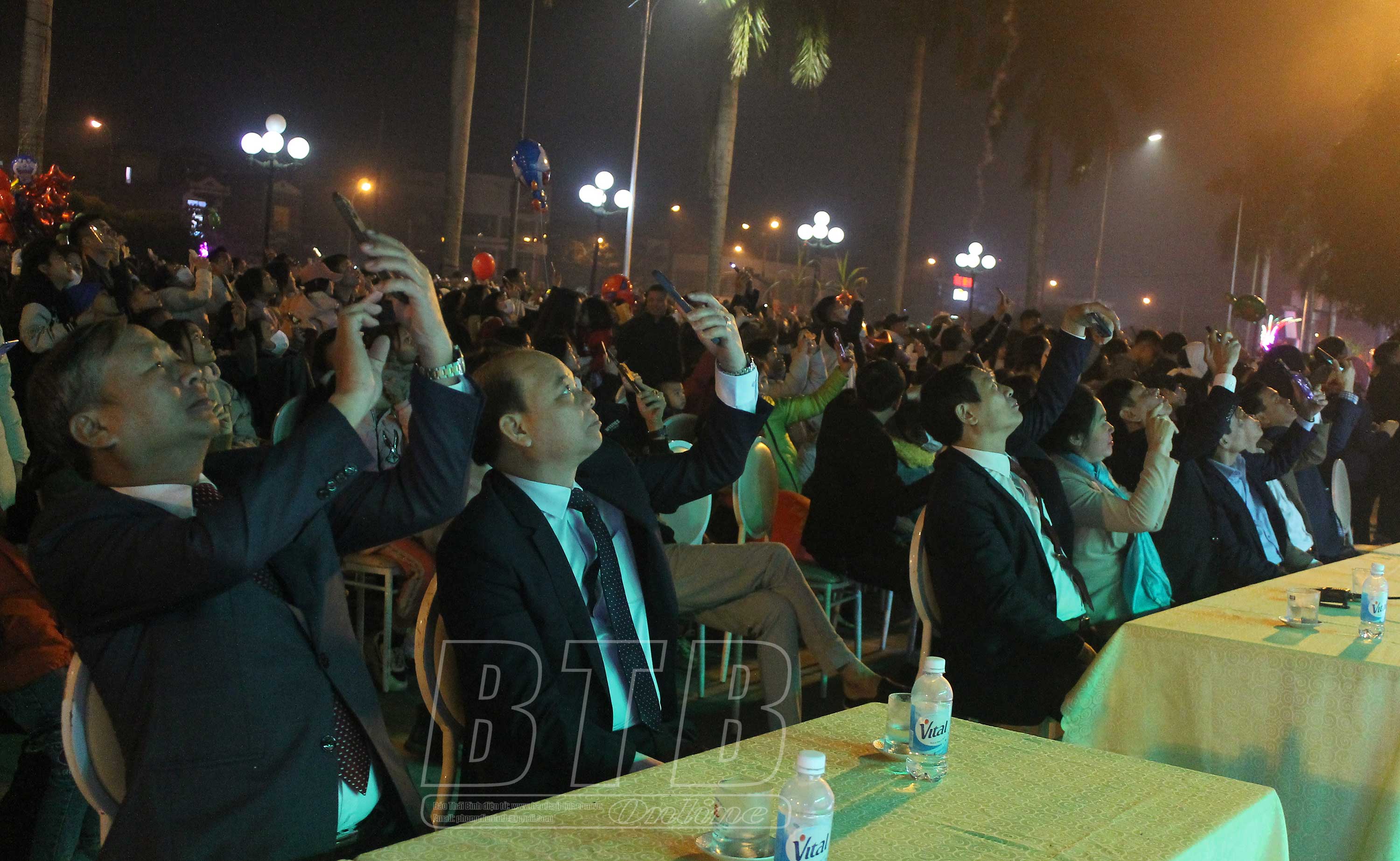 Các đồng chí lãnh đạo huyện Tiền Hải cùng nhân dân thưởng thức màn pháo hoa đêm giao thừa.