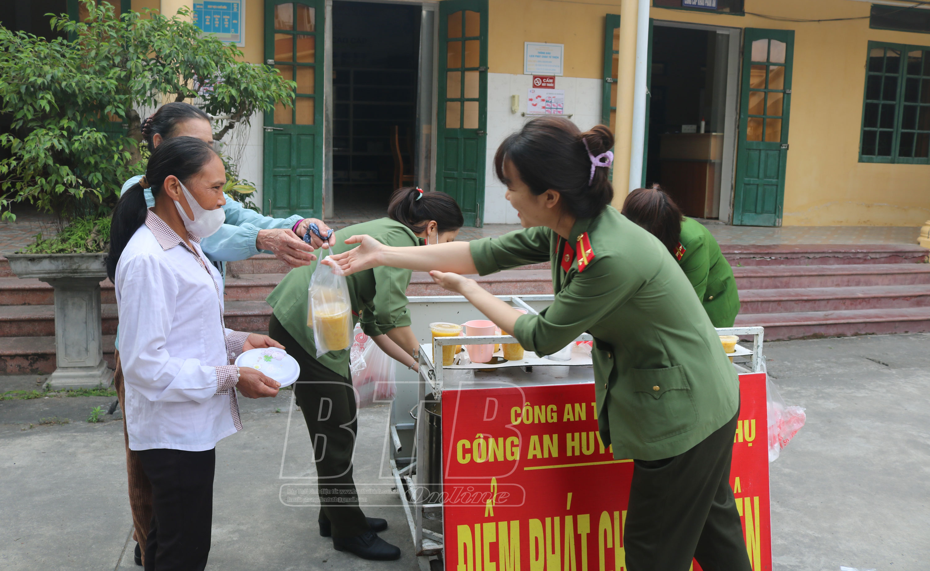 Cán bộ, hội viên Hội Phụ nữ Công an huyện Quỳnh Phụ phát cháo miễn phí tới những người bệnh có hoàn cảnh khó khăn tại Bệnh viện Đa khoa Quỳnh Phụ.