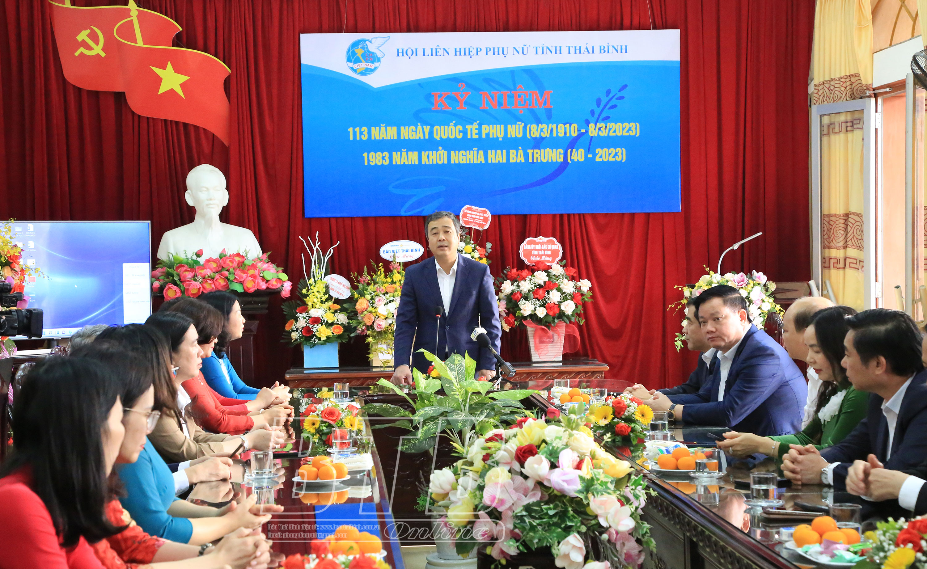 Thay mặt Tỉnh ủy, HĐND, UBND, Ủy ban MTTQ tỉnh, đồng chí Bí thư Tỉnh ủy chúc cán bộ, hội viên, phụ nữ Thái Bình luôn mạnh khỏe, vui tươi, hạnh phúc, thành công; trân trọng ghi nhận sự nỗ lực, cố gắng, đóng góp của các thế hệ phụ nữ Thái Bình đối với sự phát triển chung của tỉnh. Không chỉ trong thực hiện các nhiệm vụ chính trị, ở mọi mặt của cuộc sống, chị em còn là người giữ lửa, chăm lo, vun đắp cho hạnh phúc gia đình. Các cấp hội ngày càng có nhiều phong trào, hoạt động ý nghĩa làm nổi bật vai trò của phụ nữ, nhất là trong phát triển kinh tế, xây dựng nông thôn mới. Đồng chí mong rằng thời gian tới, hội phụ nữ các cấp, các tầng lớp cán bộ, hội viên, phụ nữ tiếp tục đóng vai trò nòng cốt, quan trọng trong thực hiện các mục tiêu, nhiệm vụ phát triển kinh tế - xã hội, trước mắt là tập trung phát triển kinh tế, xây dựng nông thôn mới nâng cao, nông thôn mới kiểu mẫu, xây dựng cuộc sống gia đình ấm no, bình đẳng, tiến bộ và hạnh phúc, nâng cao đời sống nhân dân. Hội LHPN tỉnh bám sát các nhiệm vụ, mục tiêu của tỉnh, ngày càng có thêm nhiều chương trình, kế hoạch, hoạt động để khơi dậy truyền thống, sức mạnh, sự đoàn kết, nhất trí của chị em phụ nữ để thực hiện thắng lợi các mục tiêu đã đề ra.