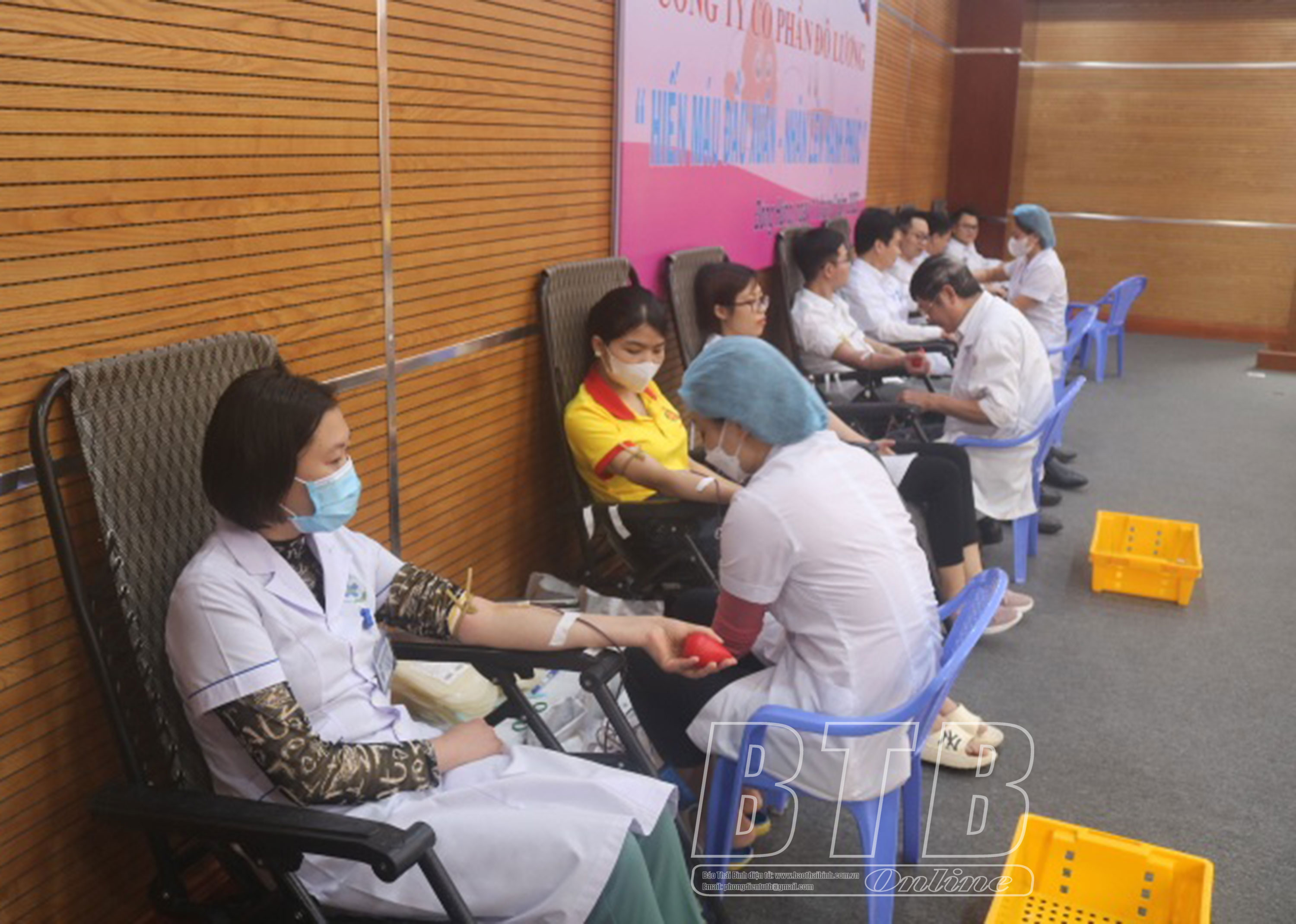 Nhân viên, người lao động Công ty Cổ phần Đô Lương và y bác sĩ Bệnh viện Đa khoa huyện Đông Hưng tham gia hiến máu tình nguyện.