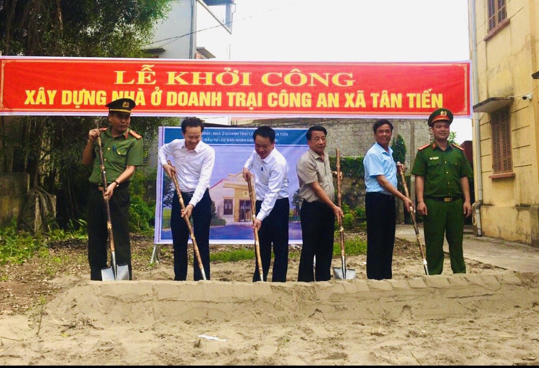 Các đồng chí lãnh đạo huyện Hưng Hà động thổ khởi công xây dựng nhà ở doanh trại cho Công an xã Tân Tiến.