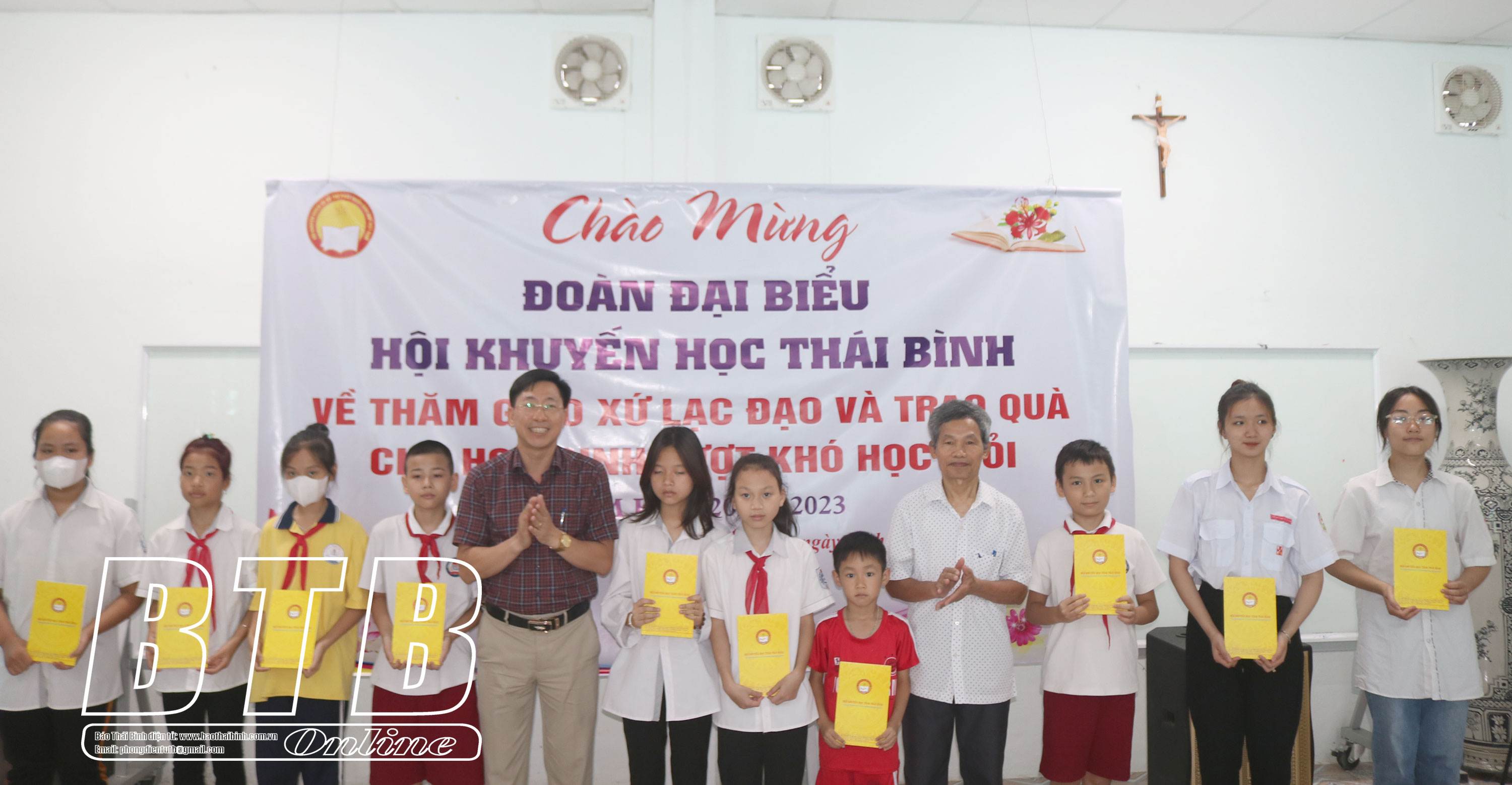 Đại diện lãnh đạo Hội Khuyến học tỉnh và lãnh đạo phường Trần Lãm (thành phố Thái Bình) trao quà cho học sinh có hoàn cảnh khó khăn của giáo xứ Lạc Đạo.