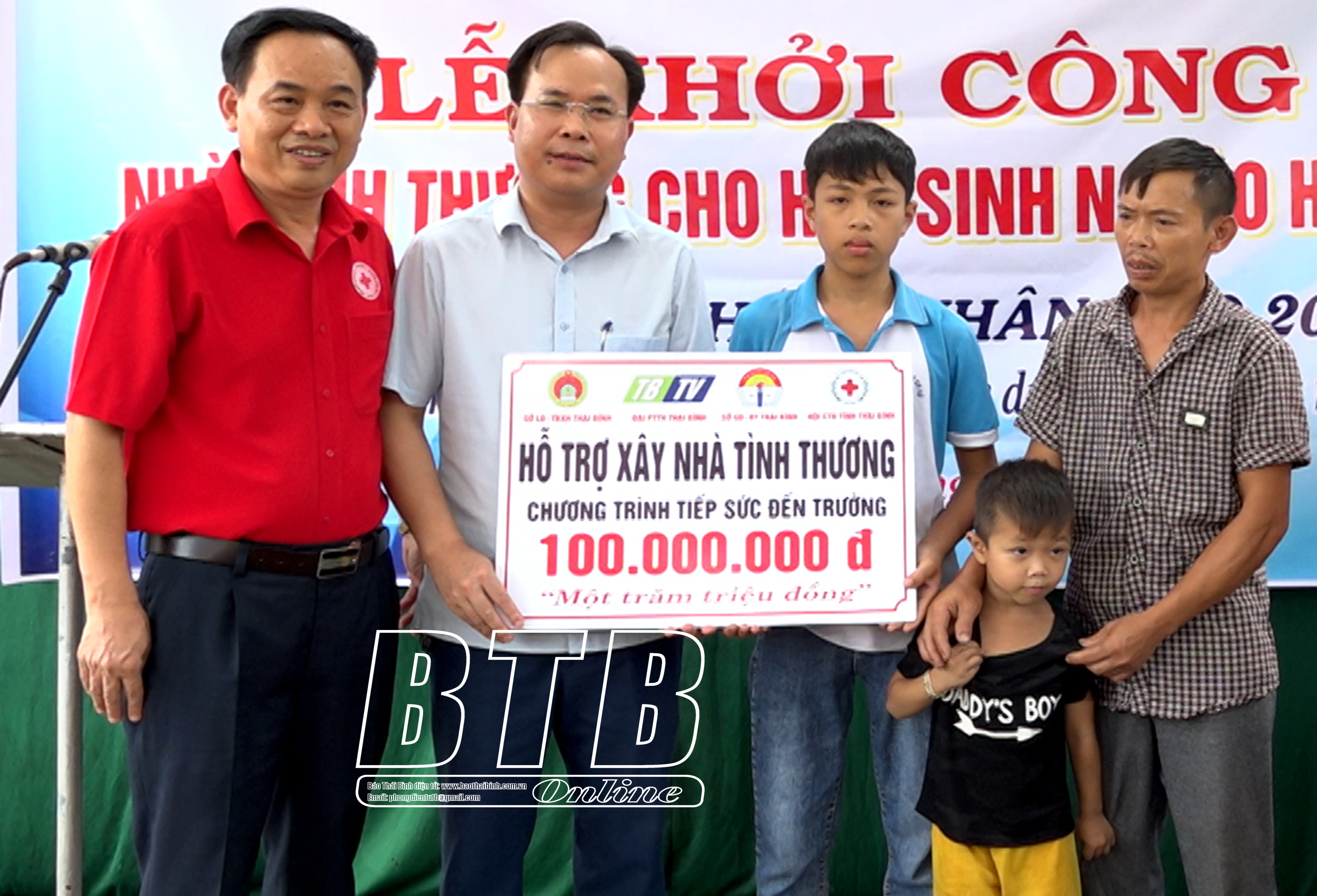 Đại diện quỹ “Tiếp sức đến trường” trao kinh phí hỗ trợ xây nhà mới cho em Trần Vũ Huy, xã An Lễ (Quỳnh Phụ).