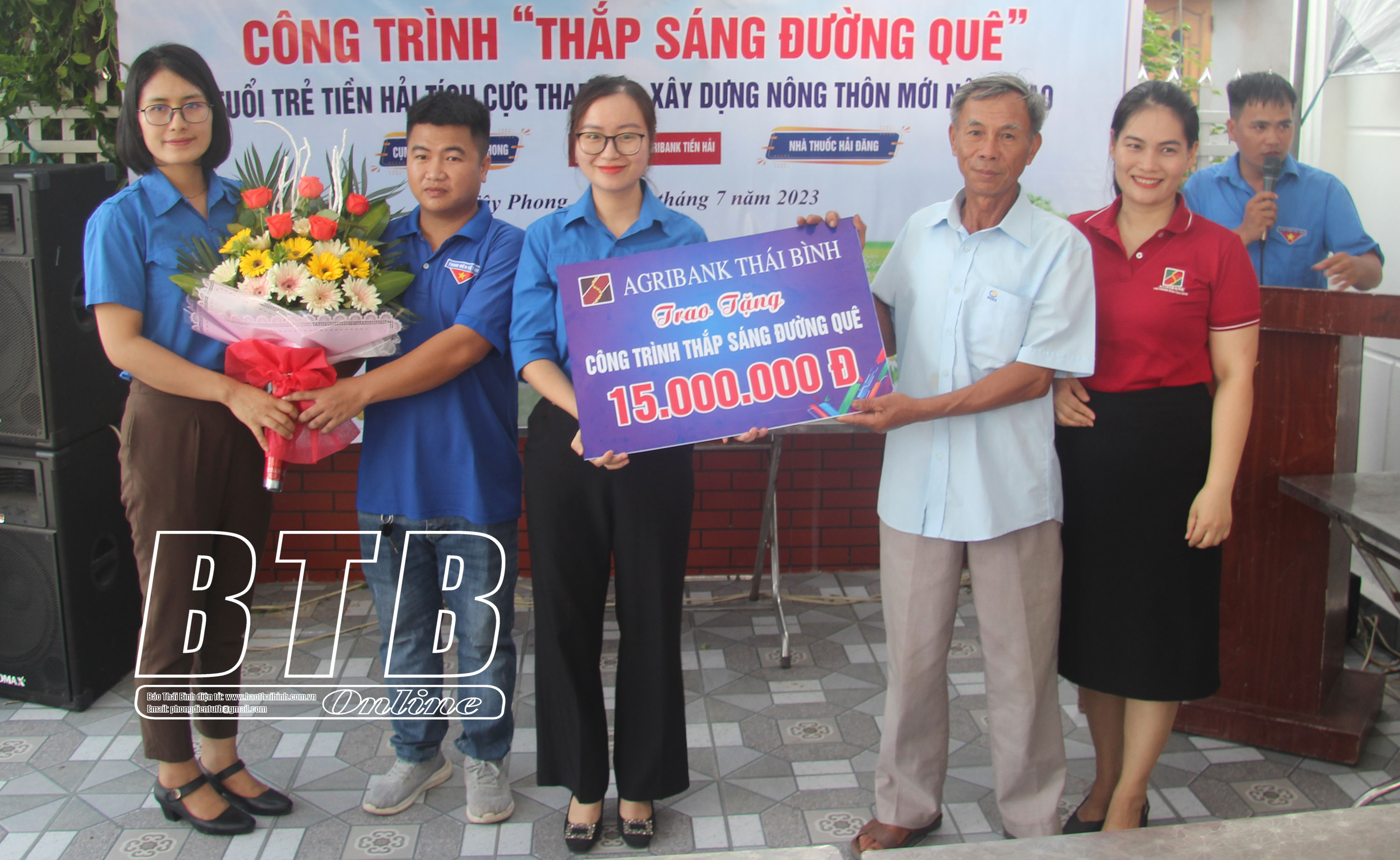 Đại diện Huyện đoàn Tiền Hải cùng các nhà tài trợ trao kinh phí hỗ trợ cho cụm dân cư thôn Lũ Phong.