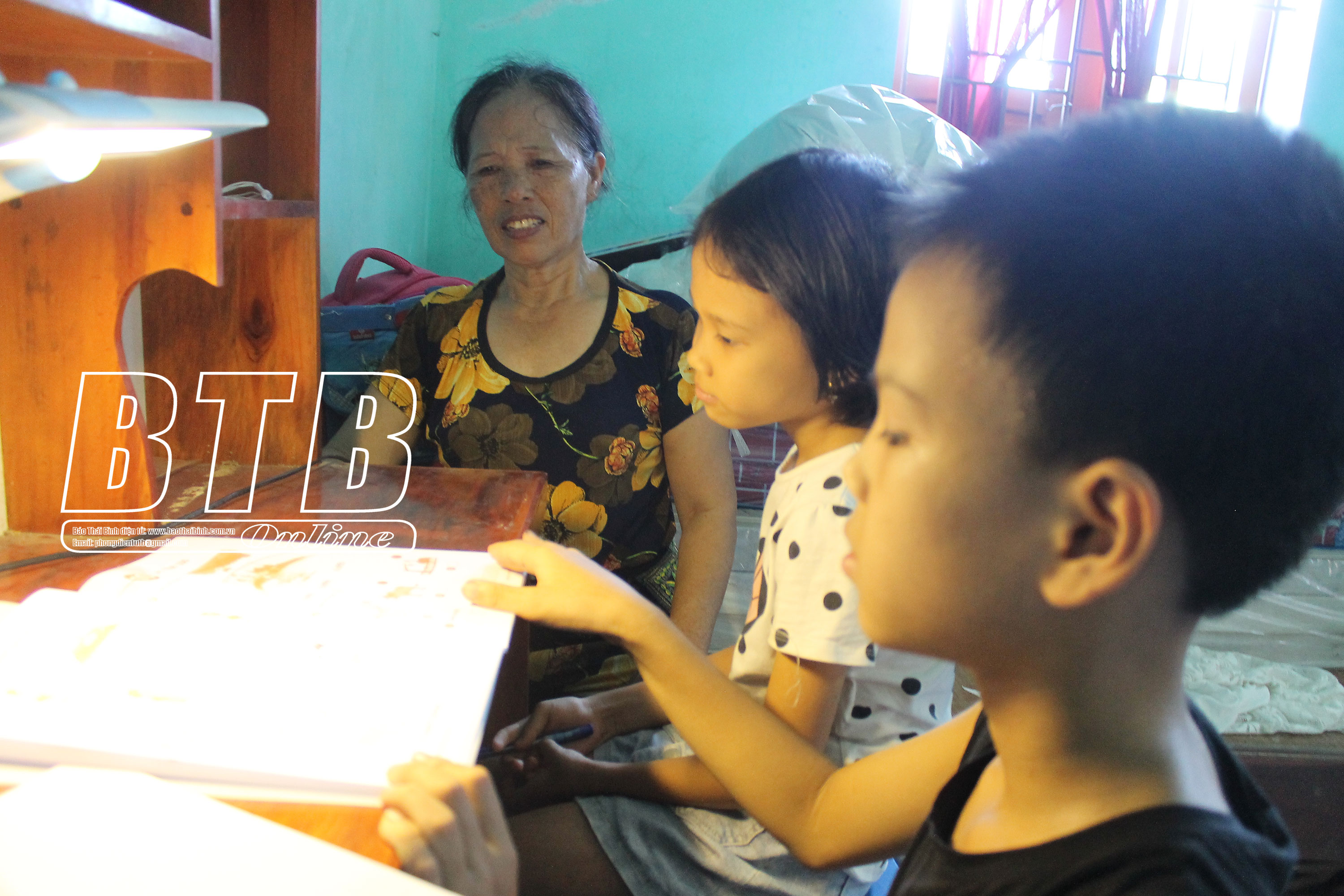 Bà Trương Thị Hiên, thôn Kiều Thần, xã Song An (Vũ Thư) quan tâm việc học của các cháu khi con trai, con dâu đi lao động ở nước ngoài.