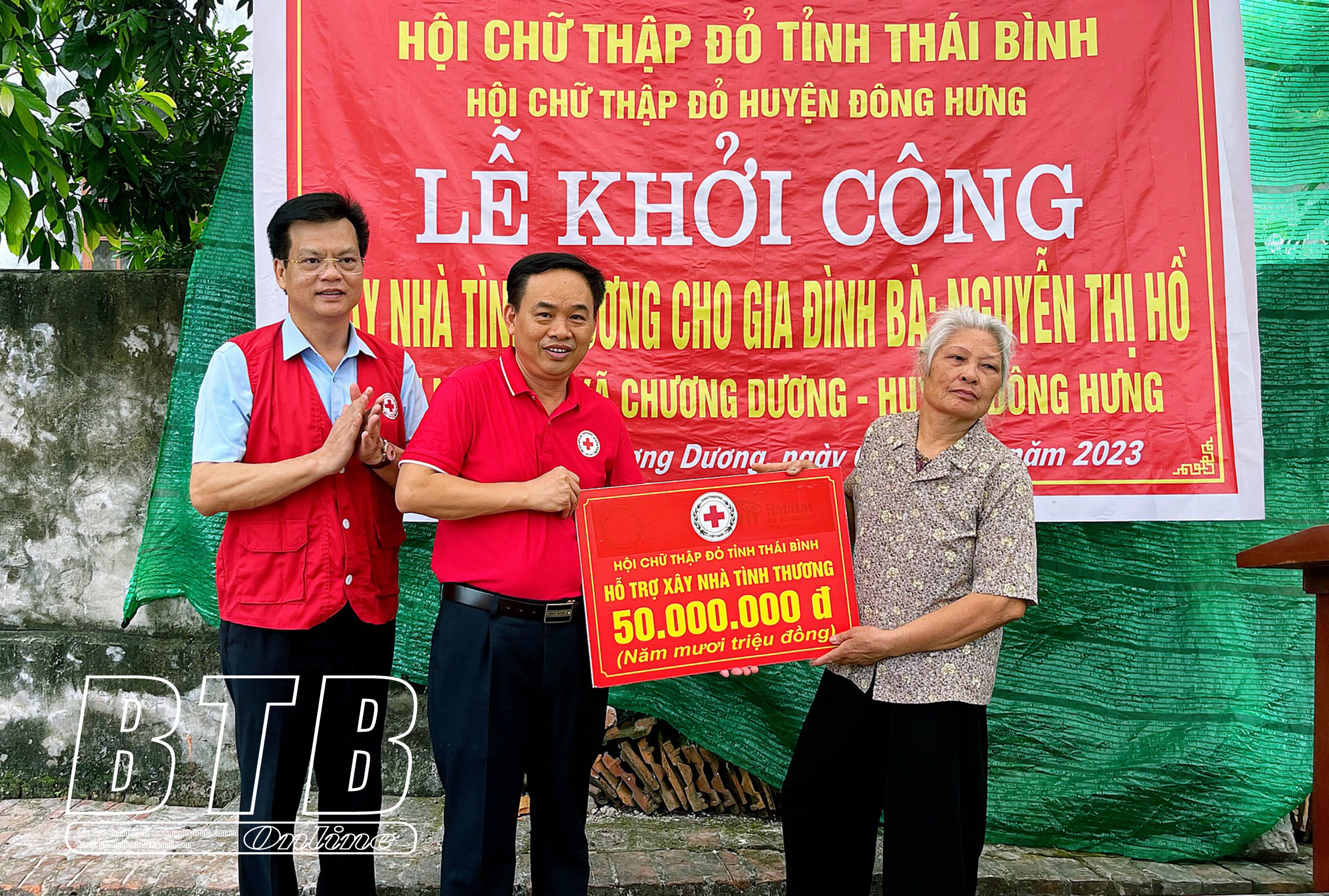 Đại diện Hội Chữ thập đỏ tỉnh trao kinh phí hỗ trợ xây nhà tình thương cho gia đình bà Nguyễn Thị Hồ, xã Chương Dương (Đông Hưng).