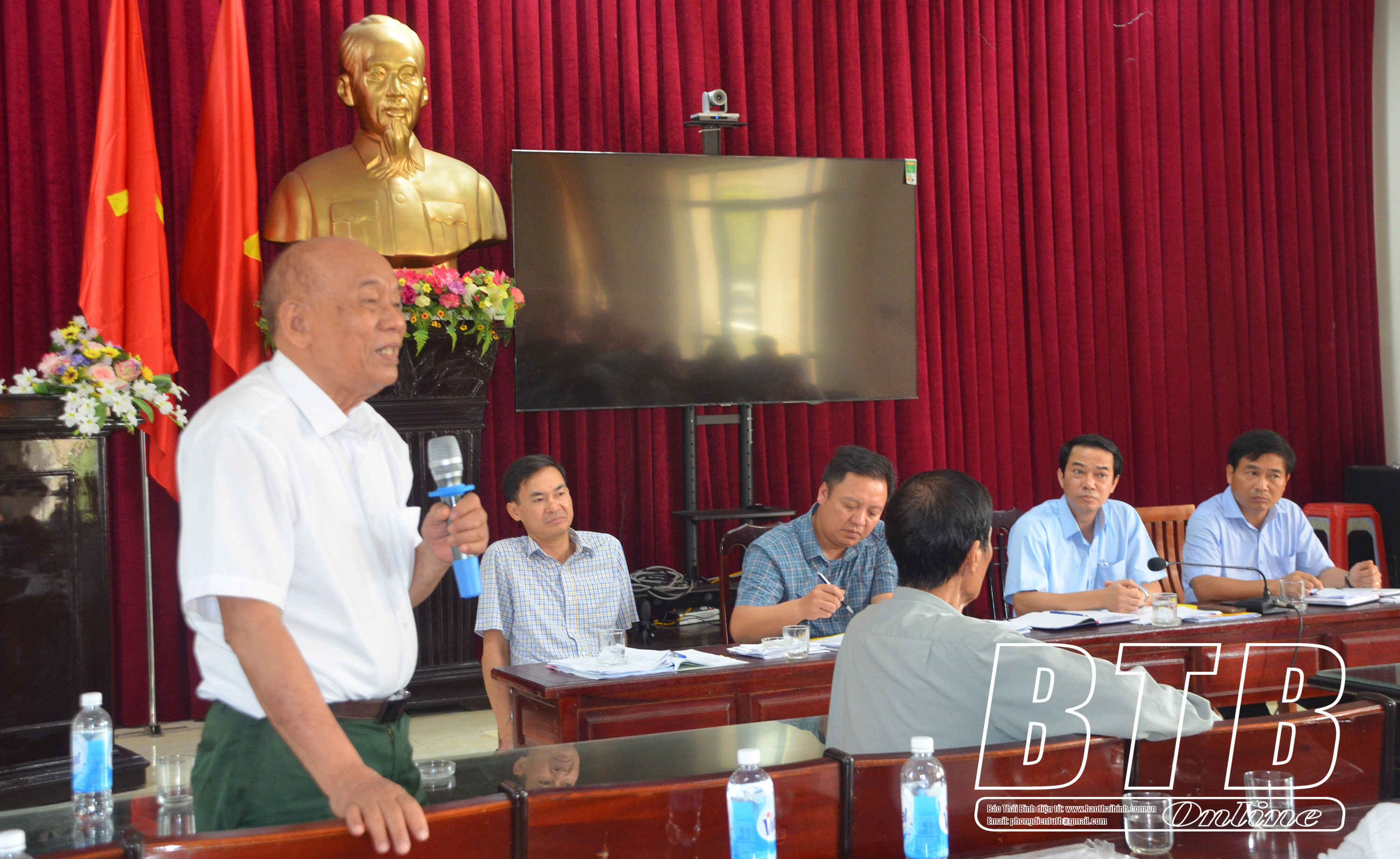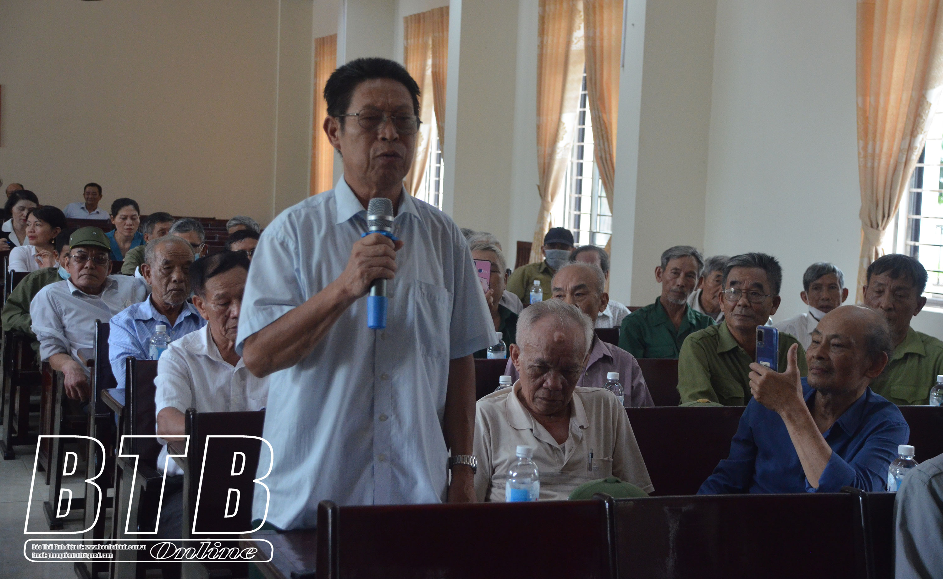 Đại diện công dân huyện Tiền Hải liên quan đến việc ngừng thực hiện chế độ người hoạt động kháng chiến bị nhiễm chất độc hóa học nêu ý kiến, kiến nghị tại buổi tiếp xúc, đối thoại.