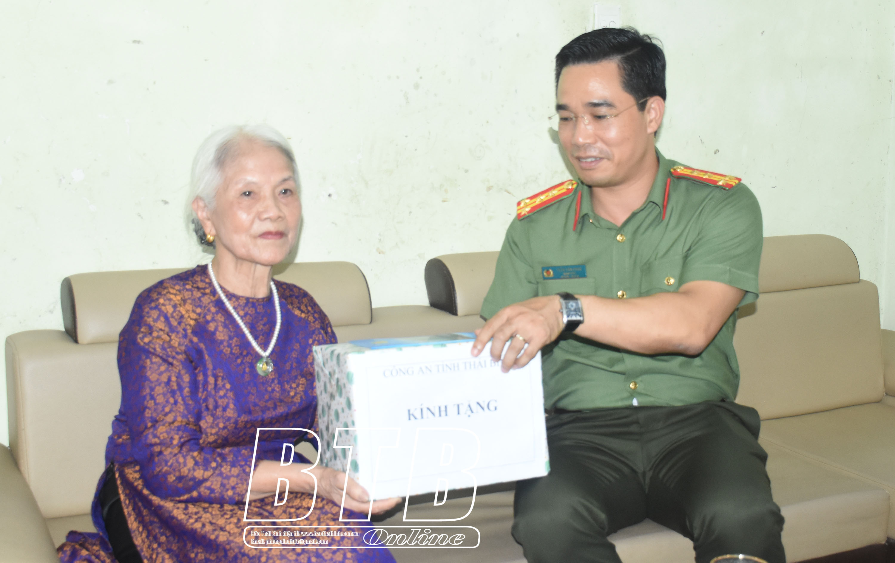 Đại tá Trần Văn Phúc, Ủy viên Ban Thường vụ Tỉnh ủy, Giám đốc Công an tỉnh tặng quà bà Phạm Thị Gái và thương binh nặng Nguyễn Duy Tơn.