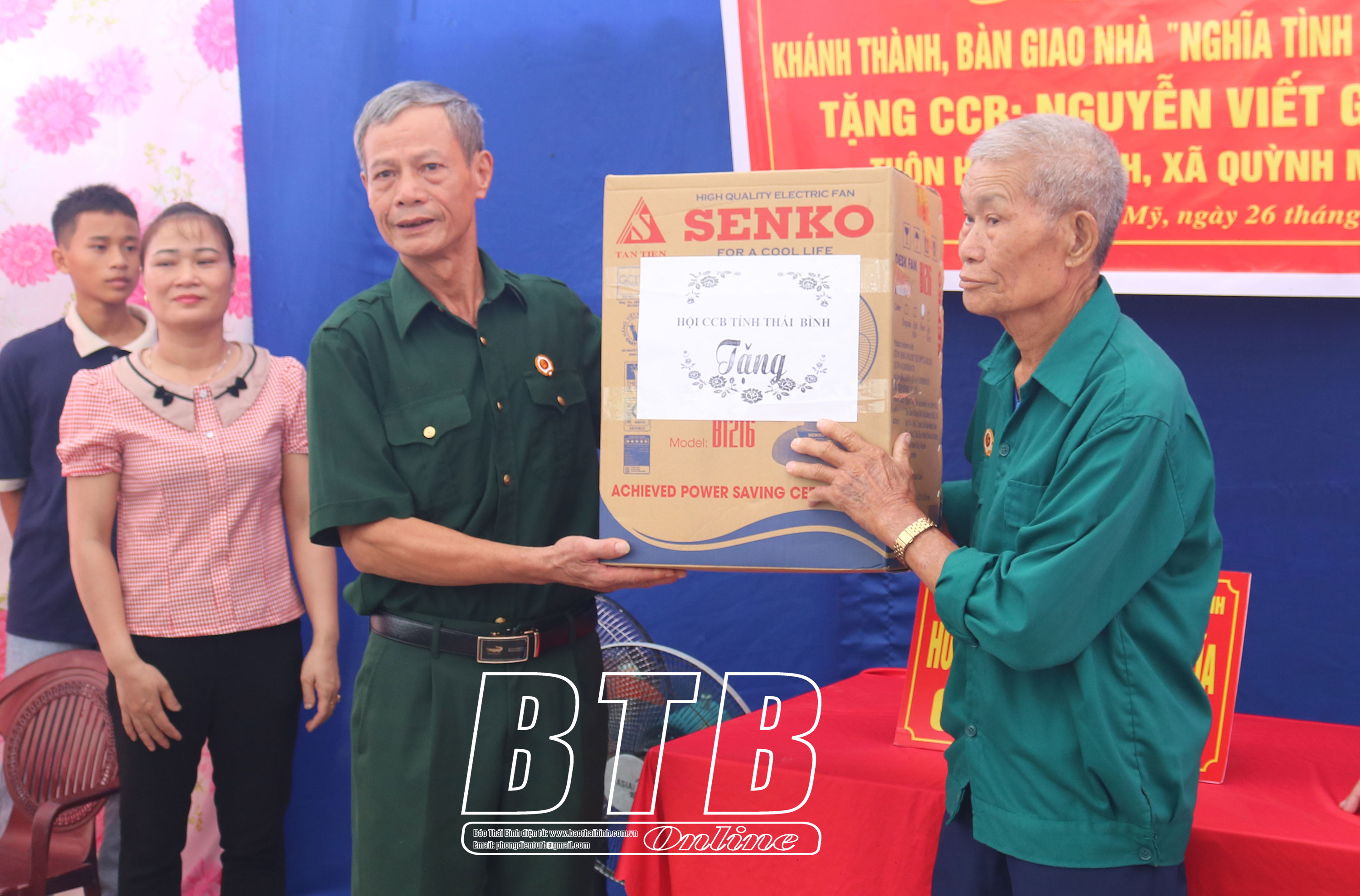 Lãnh đạo Hội Cựu chiến binh huyện Quỳnh Phụ trao quà chúc mừng.