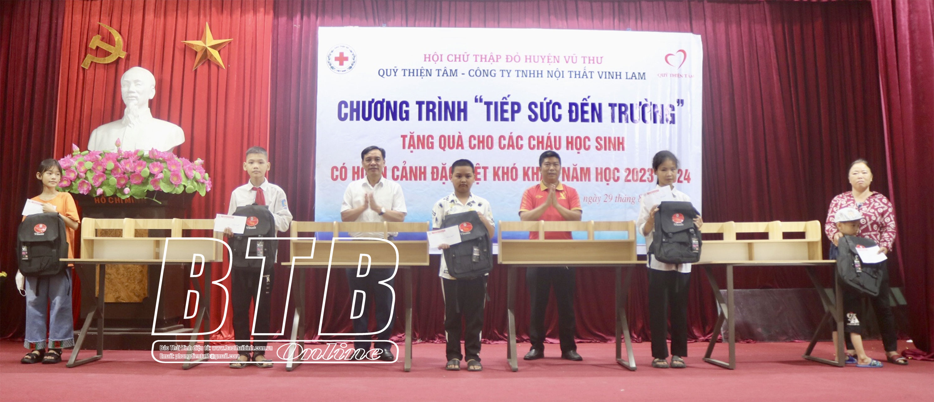 Tại chương trình, đại diện Hội Chữ thập đỏ tỉnh, huyện Vũ Thư đã trao 45 suất quà, mỗi suất trị giá gần 2 triệu đồng gồm tiền mặt và đồ dùng học tập cho 45 em học sinh có hoàn cảnh đặc biệt khó khăn trên địa bàn huyện. Toàn bộ nguồn kinh phí do Quỹ Thiện tâm, Công ty TNHH Nội thất Vinh Lam tài trợ và trích từ quỹ nhân đạo của Hội Chữ thập đỏ huyện Vũ Thư.