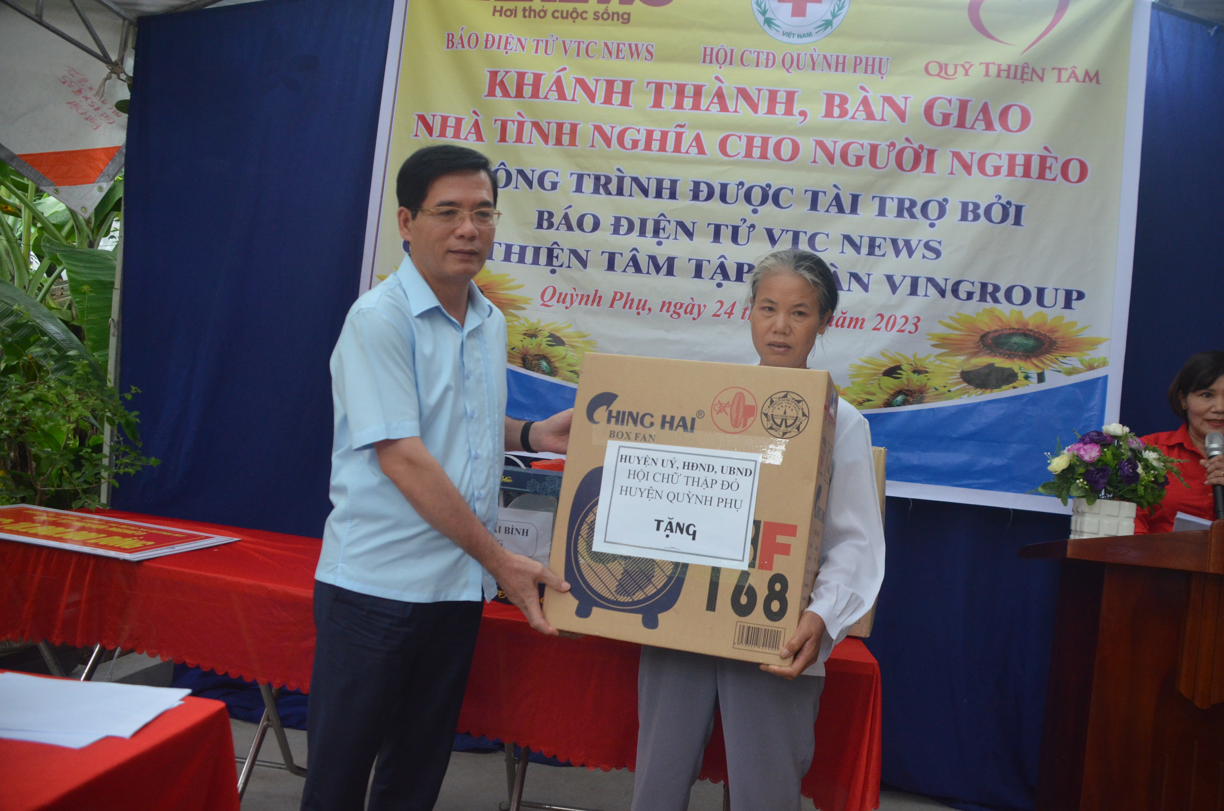 Lãnh đạo huyện Quỳnh Phụ trao quà cho gia đình bà Nguyễn Thị Tới.