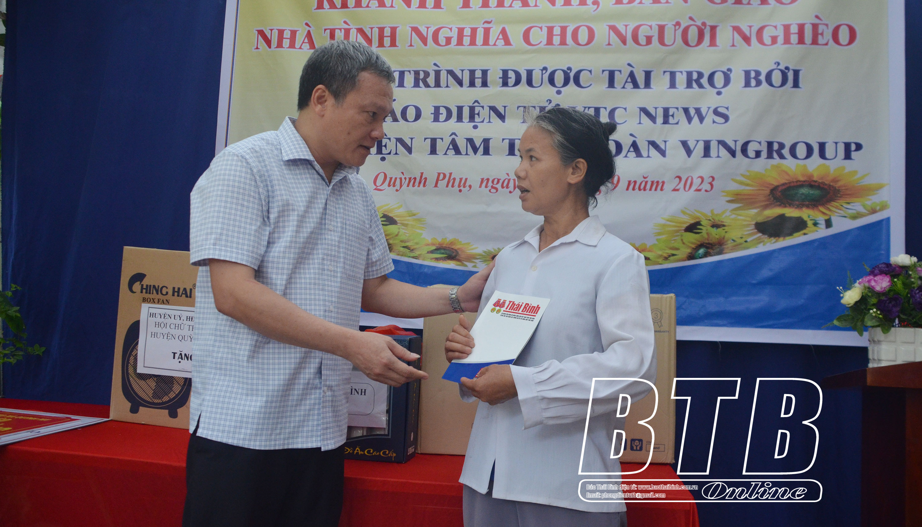 Tại lễ khánh thành, đại diện lãnh đạo Báo Thái Bình hỗ trợ gia đình bà Nguyễn Thị Tới số tiền 3 triệu đồng cùng một số vật dụng thiết yếu trong sinh hoạt.