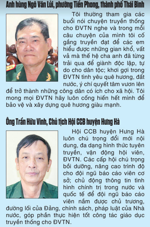 Nếu như trước kia, các hoạt động giáo dục truyền thống cách mạng chỉ được tổ chức vào các ngày lễ lớn, ngày kỷ niệm của đất nước và quân đội thì hiện nay hoạt động này được hội CCB và đoàn thanh niên các cấp tổ chức thường xuyên bằng nhiều hình thức sinh động, thu hút đông đảo hội viên, ĐVTN tham gia.