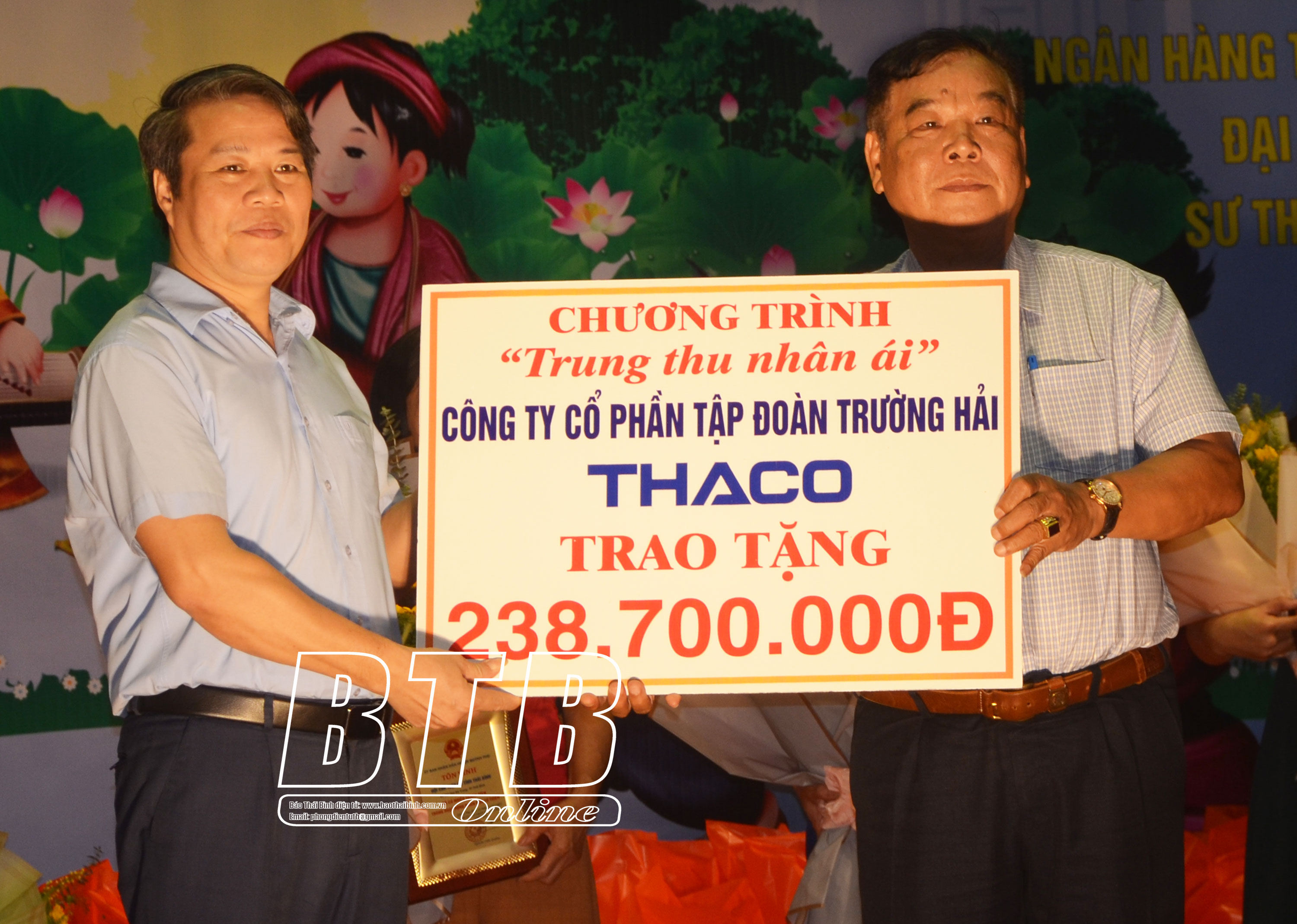 Đại diện nhà tài trợ trao kinh phí hỗ trợ chương trình “Trung thu nhân ái” của huyện Quỳnh Phụ.