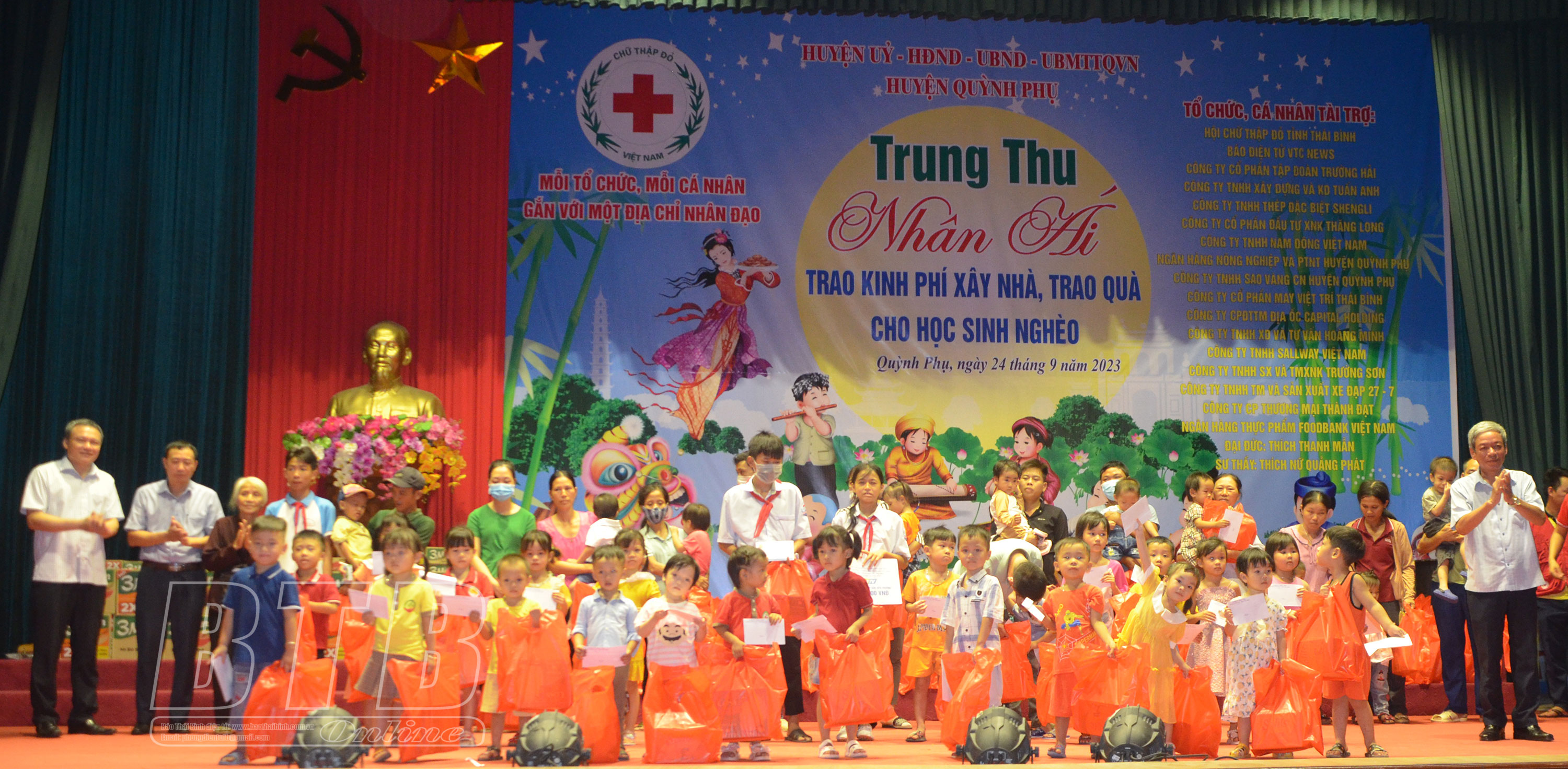 Các đơn vị, tổ chức, doanh nghiệp tặng quà trung thu cho các cháu thiếu niên, nhi đồng có hoàn cảnh khó khăn huyện Quỳnh Phụ.