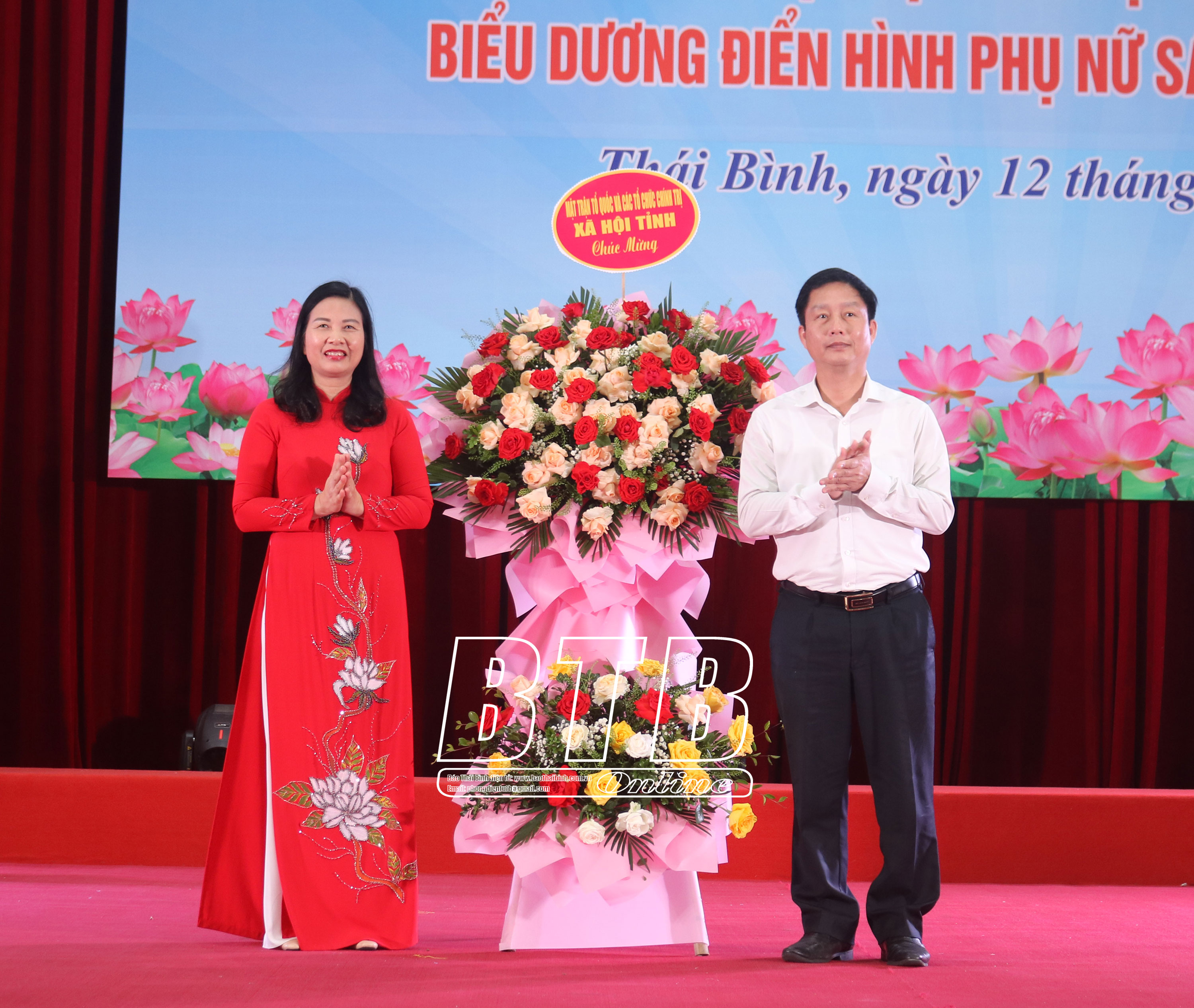 Đồng chí Vũ Thanh Vân, Ủy viên Ban Thường vụ Tỉnh ủy, Chủ tịch Ủy ban MTTQ tỉnh tặng hoa chúc mừng.