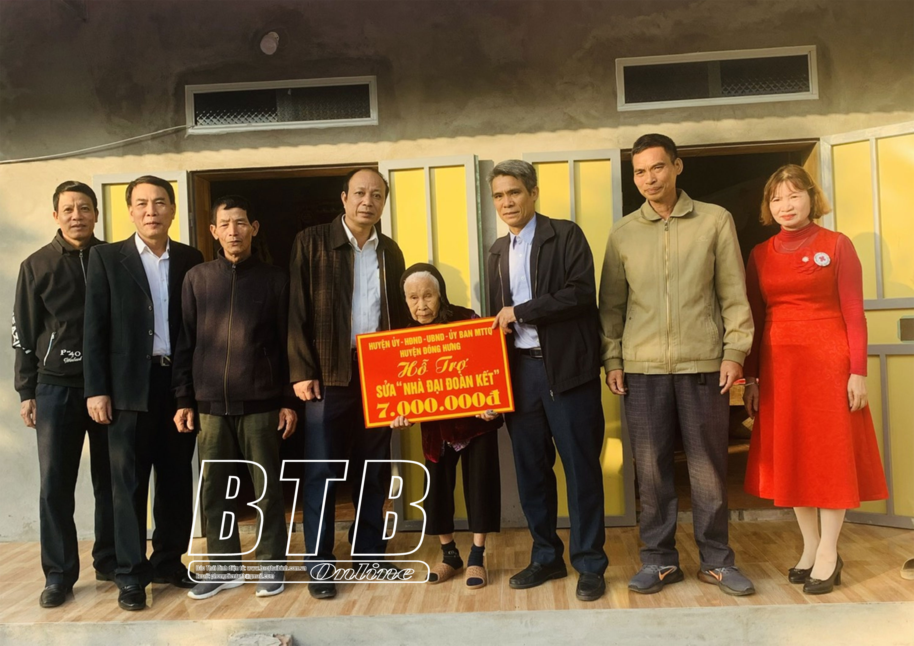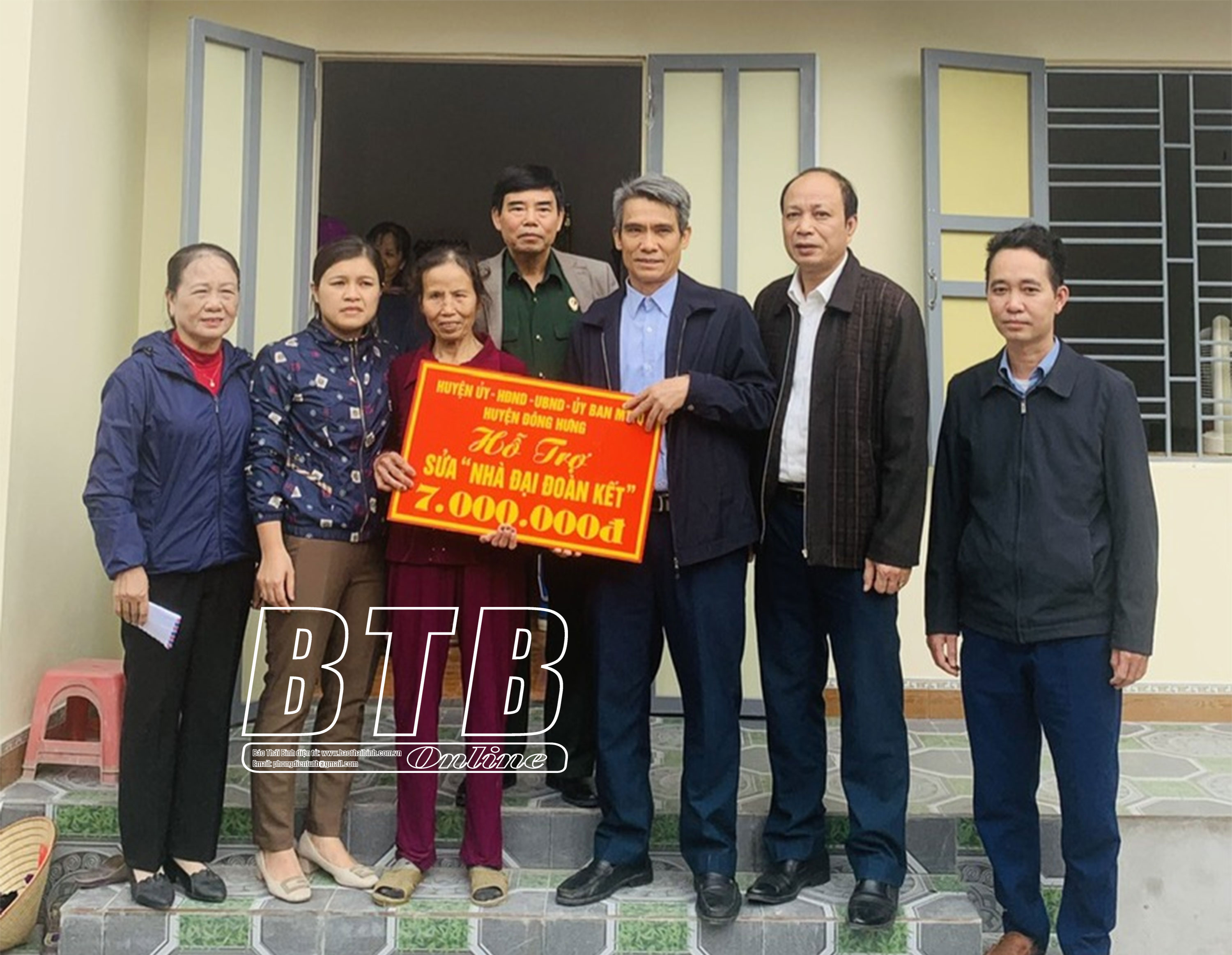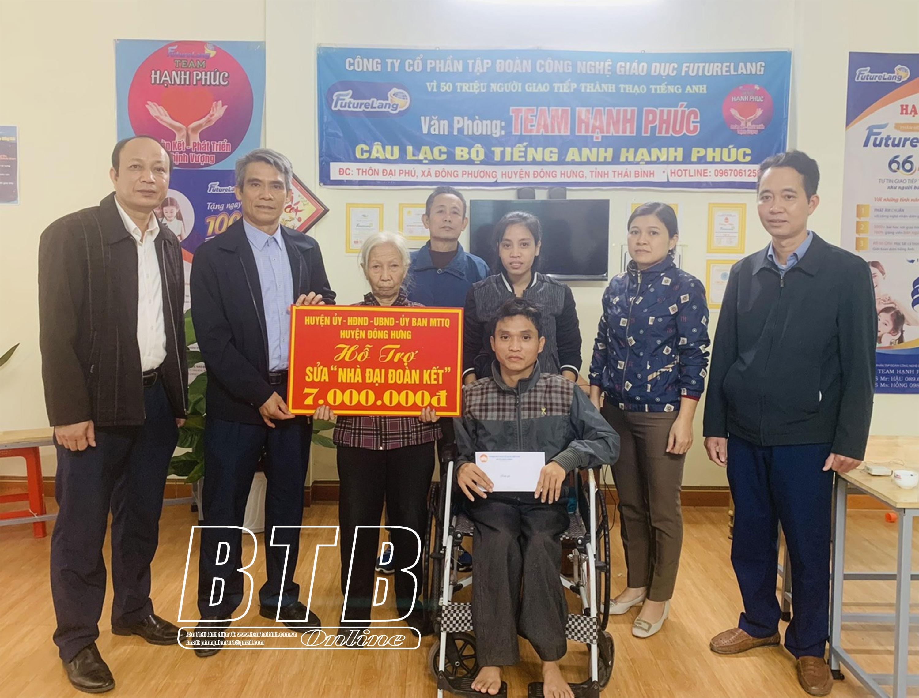 Theo đó, Ủy ban MTTQ huyện đã trích quỹ “Vì người nghèo” trao kinh phí hỗ trợ xây dựng và tổ chức khánh thành, bàn giao 2 nhà đại đoàn kết cho hộ bà Bùi Thị Lan (xã Đông Kinh) và hộ ông Nguyễn Viết Điện (thị trấn Đông Hưng) với mức hỗ trợ 50 triệu đồng/hộ; đồng thời trao kinh phí hỗ trợ sửa chữa nhà cho 3 hộ gồm: hộ bà Nguyễn Thị Rần và hộ bà Vũ Thị Đức (xã Đông Phương), hộ ông Bùi Lai Sơn (xã Đông Quan) với mức hỗ trợ 7 triệu đồng/nhà.