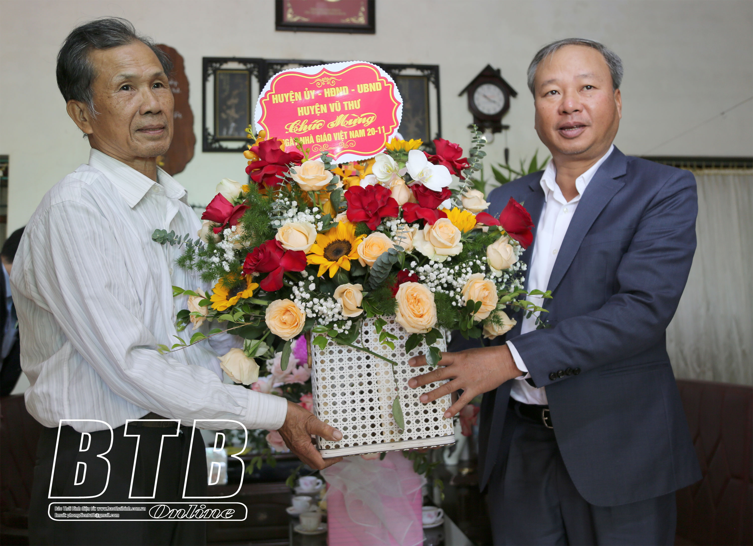 Đồng chí Nguyễn Quang Anh, Bí thư Huyện ủy Vũ Thư tặng hoa chúc mừng Nhà giáo ưu tú Phạm Văn Khuê.