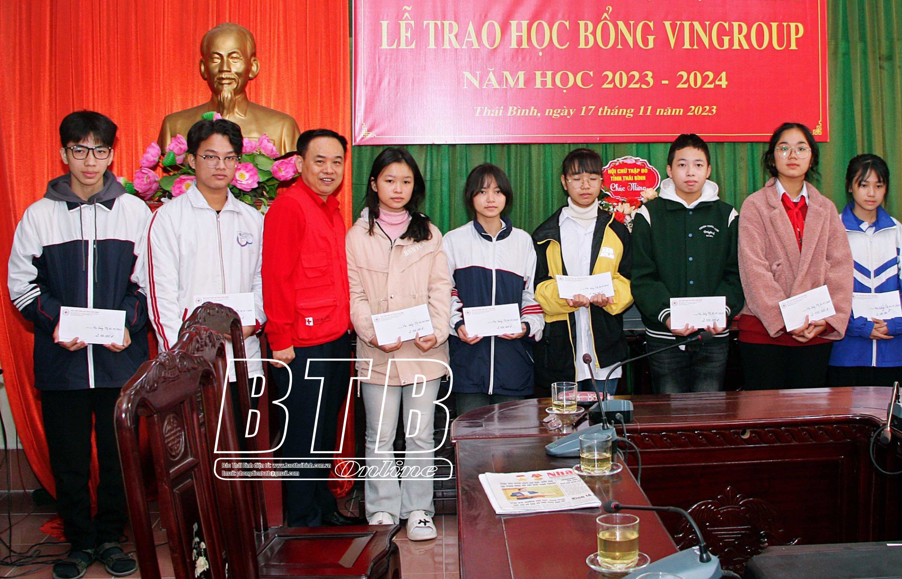 Đại diện Hội Chữ thập đỏ tỉnh trao học bổng của Quỹ Thiện Tâm (Tập đoàn Vingroup) cho học sinh nghèo vượt khó, học giỏi trên địa bàn tỉnh.