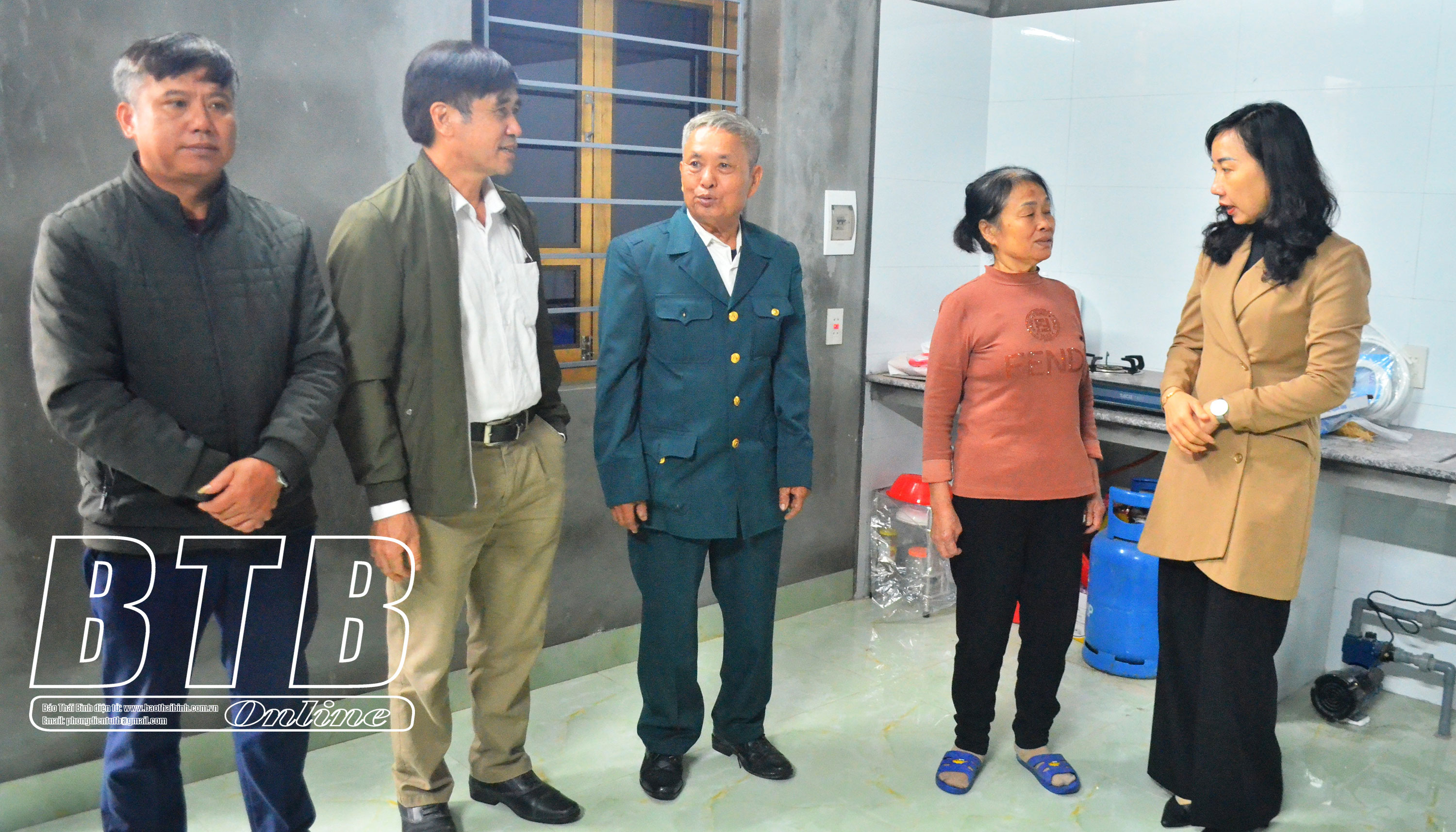 Các đồng chí lãnh đạo Ủy ban MTTQ thành phố, xã Vũ Chính thăm hỏi, chúc mừng bà Vũ Thị Đáng bên ngôi nhà mới hoàn thành.