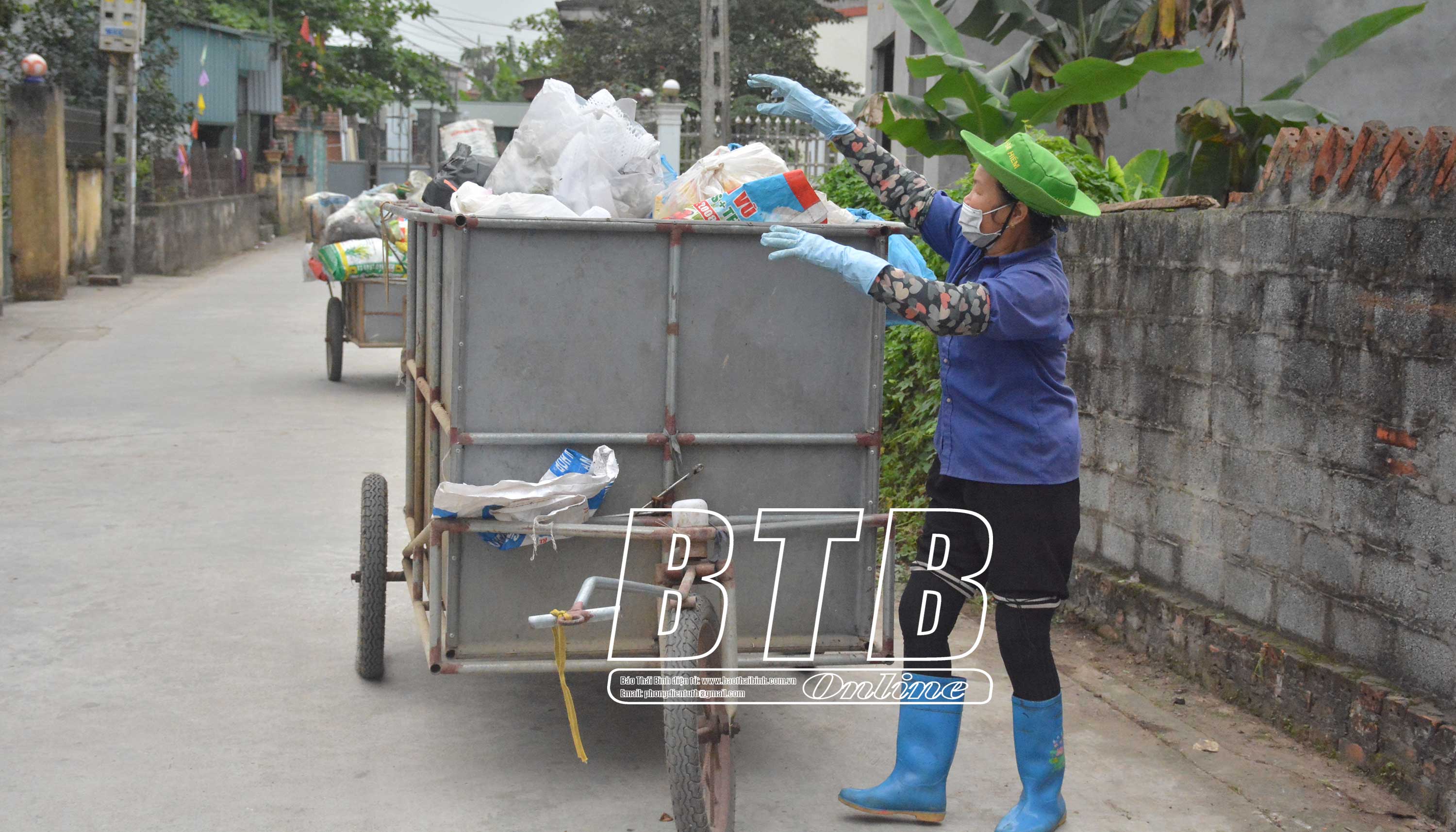 Thành viên HTX Dịch vụ thu gom rác thải sinh hoạt xã Đông Kinh (Đông Hưng) thu gom rác thải tại các khu dân cư.