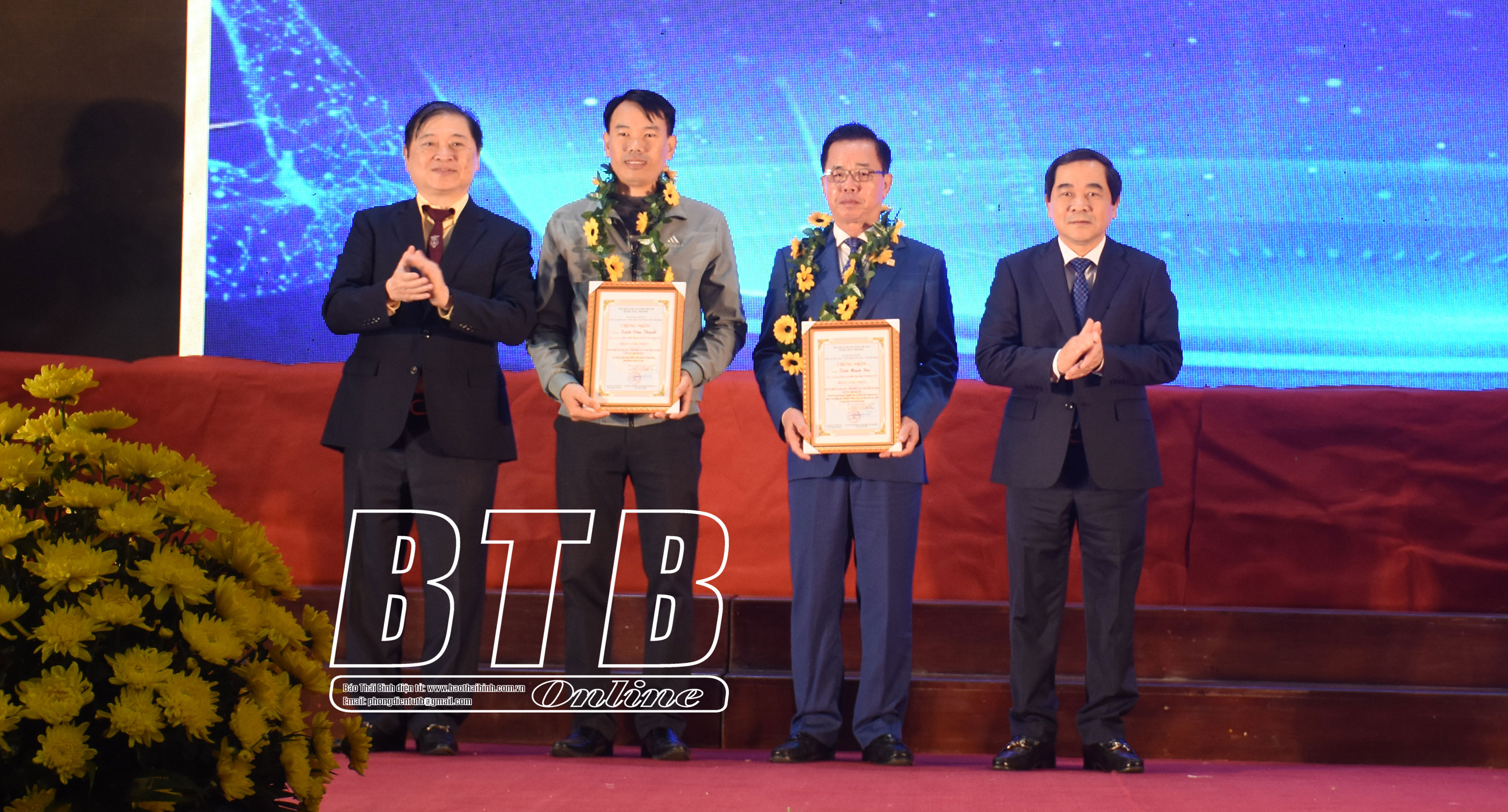 Đồng chí Phan Xuân Dũng, Chủ tịch Liên hiệp các Hội Khoa học và Kỹ thuật Việt Nam và đồng chí Nguyễn Tiến Thành, Phó Bí thư Thường trực Tỉnh ủy, Chủ tịch HĐND tỉnh trao giải nhất cho các tác giả tham gia hội thi.