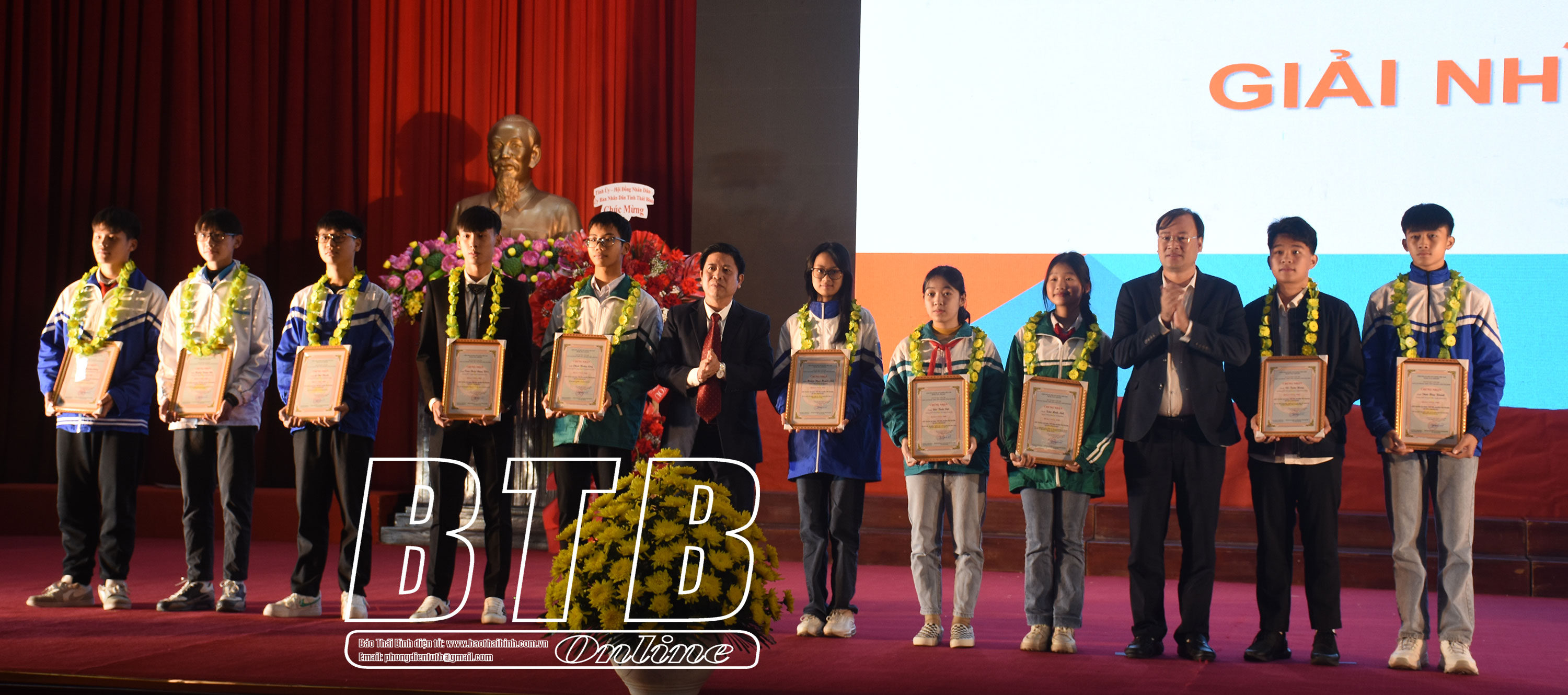 Các đồng chí: Vũ Thanh Vân, Ủy viên Ban thường vụ Tỉnh ủy, Chủ tịch Ủy ban MTTQ tỉnh; Trần Thị Bích Hằng, Tỉnh ủy viên, Phó Chủ tịch UBND tỉnh trao giải nhì cho các tác giả tham gia hội thi.
