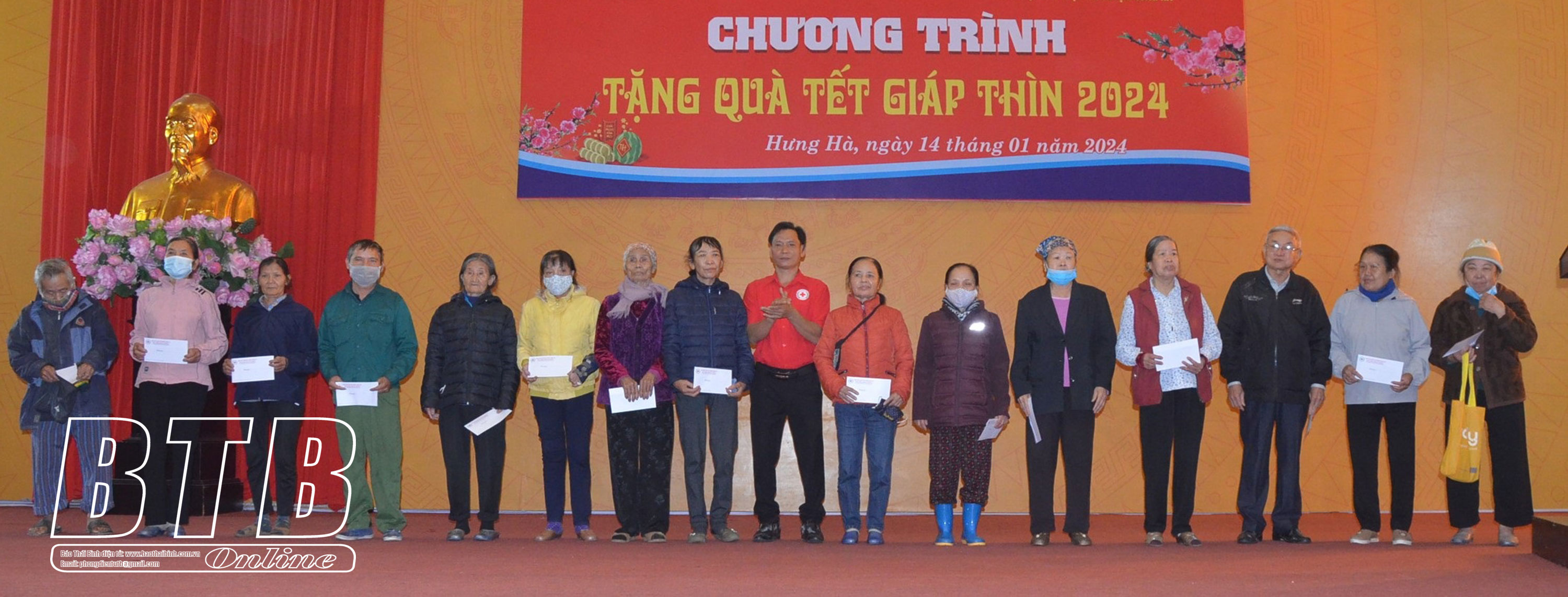 Nhân dịp tết Nguyên đán Giáp Thìn 2024, sáng ngày 14/1, Hội Chữ thập đỏ huyện Hưng Hà phối hợp với Quỹ Thiện Tâm, Tập đoàn Vingroup tổ chức trao tặng quà tết cho các hộ nghèo, cận nghèo, hộ có hoàn cảnh đặc biệt khó khăn trên địa bàn huyện.