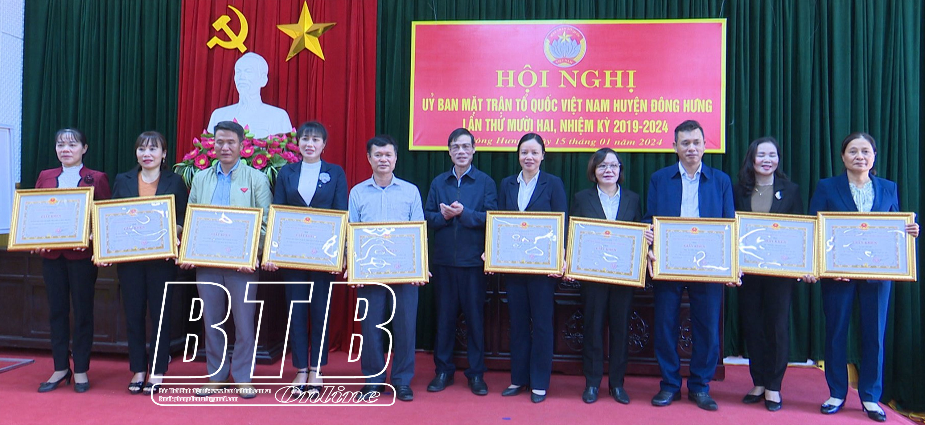 Năm 2023, ủy ban MTTQ các cấp huyện Đông Hưng đã đổi mới nội dung, phương thức hoạt động, tổ chức triển khai thực hiện đồng bộ, hiệu quả các nhiệm vụ công tác, các phong trào thi đua yêu nước, cuộc vận động “Toàn dân đoàn kết xây dựng nông thôn mới, đô thị văn minh”, xây dựng quỹ “Vì người nghèo”... Trong năm, 100% khu dân cư tổ chức ngày hội đại đoàn kết toàn dân. Tại ngày hội, trên 9.000 hộ gia đình văn hóa được biểu dương, khen thưởng; hộ nghèo, hộ có hoàn cảnh khó khăn được ủy ban MTTQ các cấp trao quà. Qua bình xét, năm 2023 toàn huyện có 75.708/80.972 gia đình đạt danh hiệu gia đình văn hóa, 212/229 thôn, tổ dân phố đạt danh hiệu thôn, tổ dân phố văn hóa. Ủy ban MTTQ các cấp cũng đã huy động các nguồn lực hỗ trợ xây dựng mới, sửa chữa 28 nhà đại đoàn kết, trị giá 1,8 tỷ đồng. Bên cạnh đó, ủy ban MTTQ các cấp phối hợp tổ chức 221 hội nghị tiếp xúc cử tri với đại biểu HĐND các cấp, tổng hợp trên 1.300 ý kiến, kiến nghị của cử tri gửi các cấp có thẩm quyền xem xét, giải quyết. Ủy ban MTTQ các cấp thực hiện tốt vai trò đại diện, bảo vệ quyền lợi hợp pháp, chính đáng của nhân dân, tăng cường giám sát và phản biện xã hội, tham gia xây dựng Đảng, chính quyền vững mạnh.