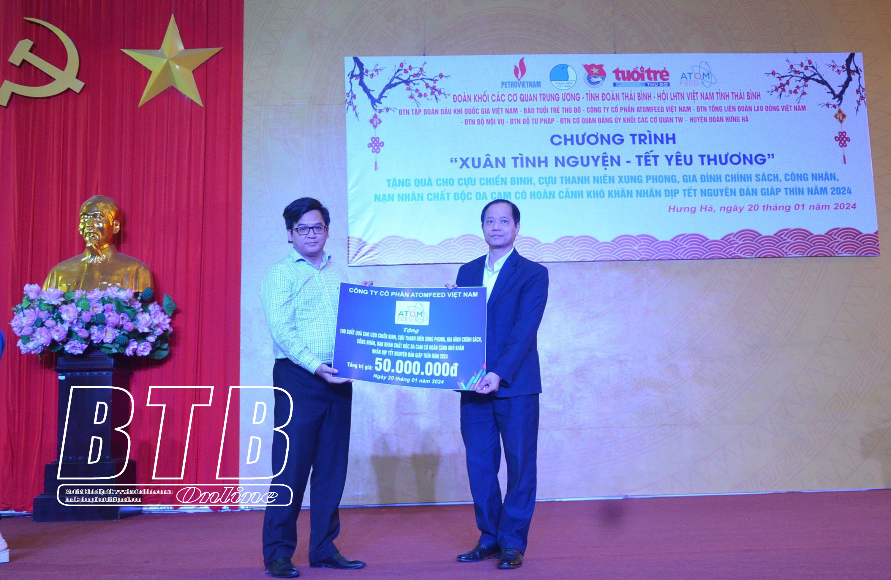 Công ty Cổ phần Atomfeed Việt Nam trao 100 suất quà cho gia đình chính sách và công nhân có hoàn cảnh khó khăn trên địa bàn huyện Hưng Hà.