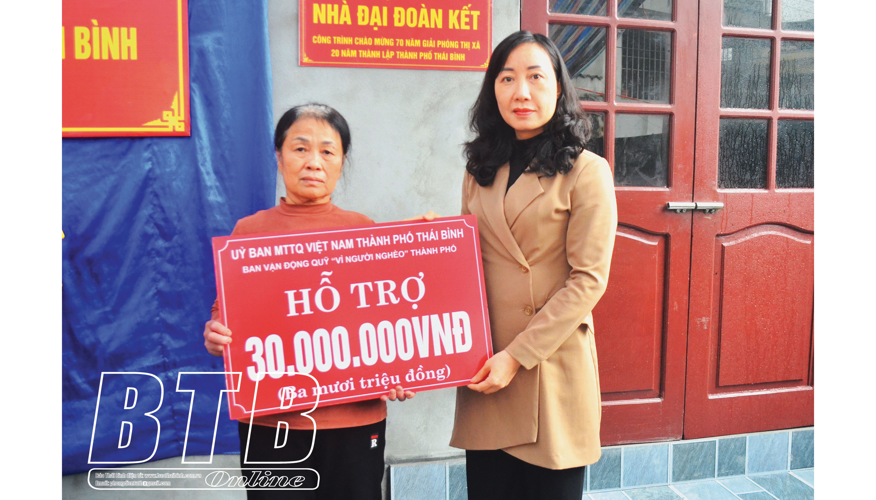 Bà Vũ Thị Đáng, 65 tuổi, xã Vũ Chính là hộ nghèo đơn thân, không nơi nương tựa, được MTTQ thành phố hỗ trợ 30 triệu đồng xây dựng nhà đại đoàn kết, bà chia sẻ: Nhiều năm sống trong ngôi nhà xuống cấp, dột nát, nền nhà thấp hơn so với mặt đường nên khi mưa to, gió bão nước tràn vào nhà; nhưng tết này tôi đã được đón tết trong ngôi nhà mới, kiên cố rộng 35m2, thật không có gì nói hết niềm vui này. Xin cảm ơn các cấp ủy đảng, chính quyền, đoàn thể đã quan tâm hỗ trợ tôi.