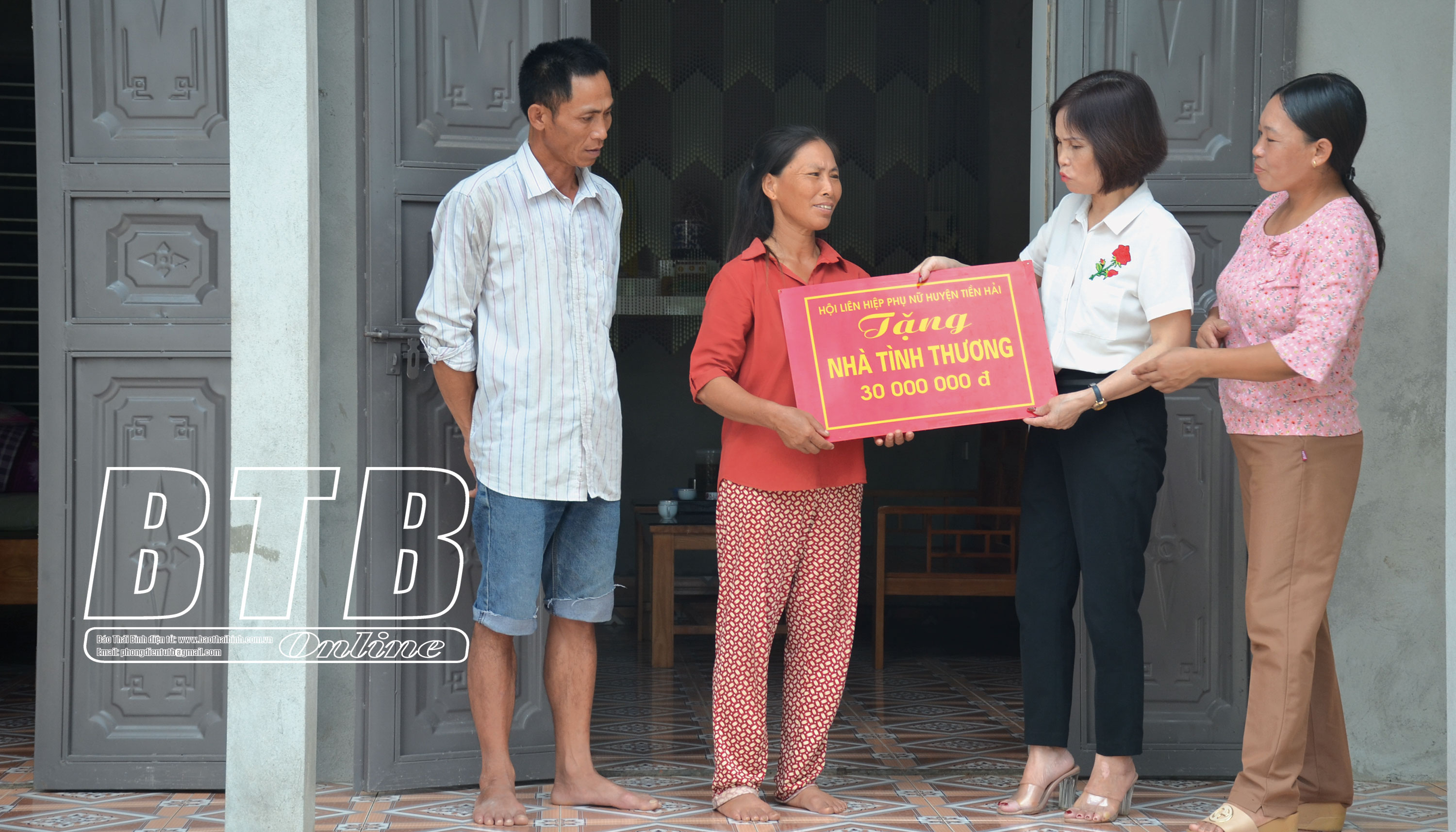 Bà Vũ Thị Sẻ (ngoài cùng bên phải) cùng lãnh đạo Hội Liên hiệp Phụ nữ huyện Tiền Hải trao biển hỗ trợ kinh phí xây nhà cho bà Vũ Thị Nhung.