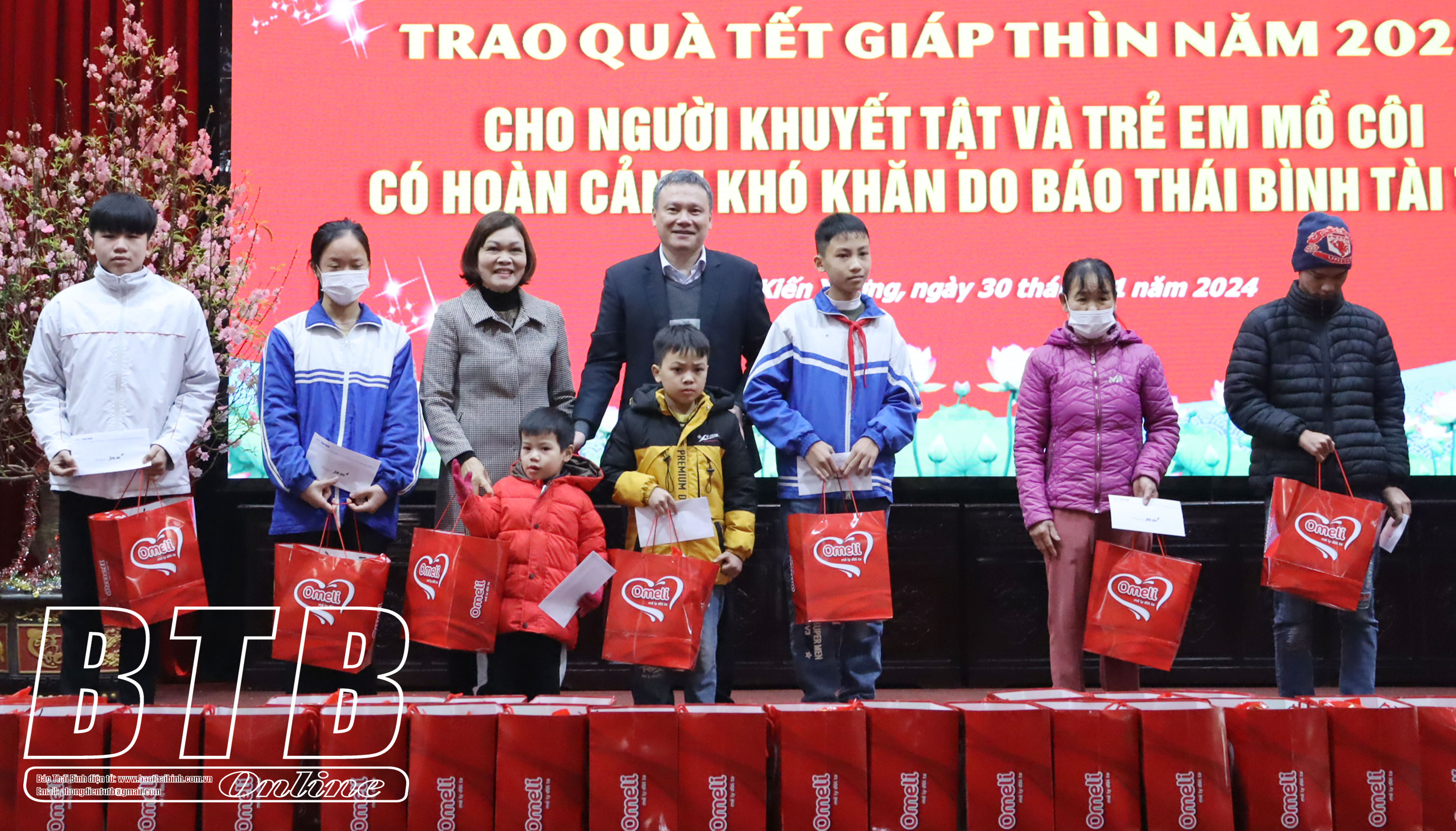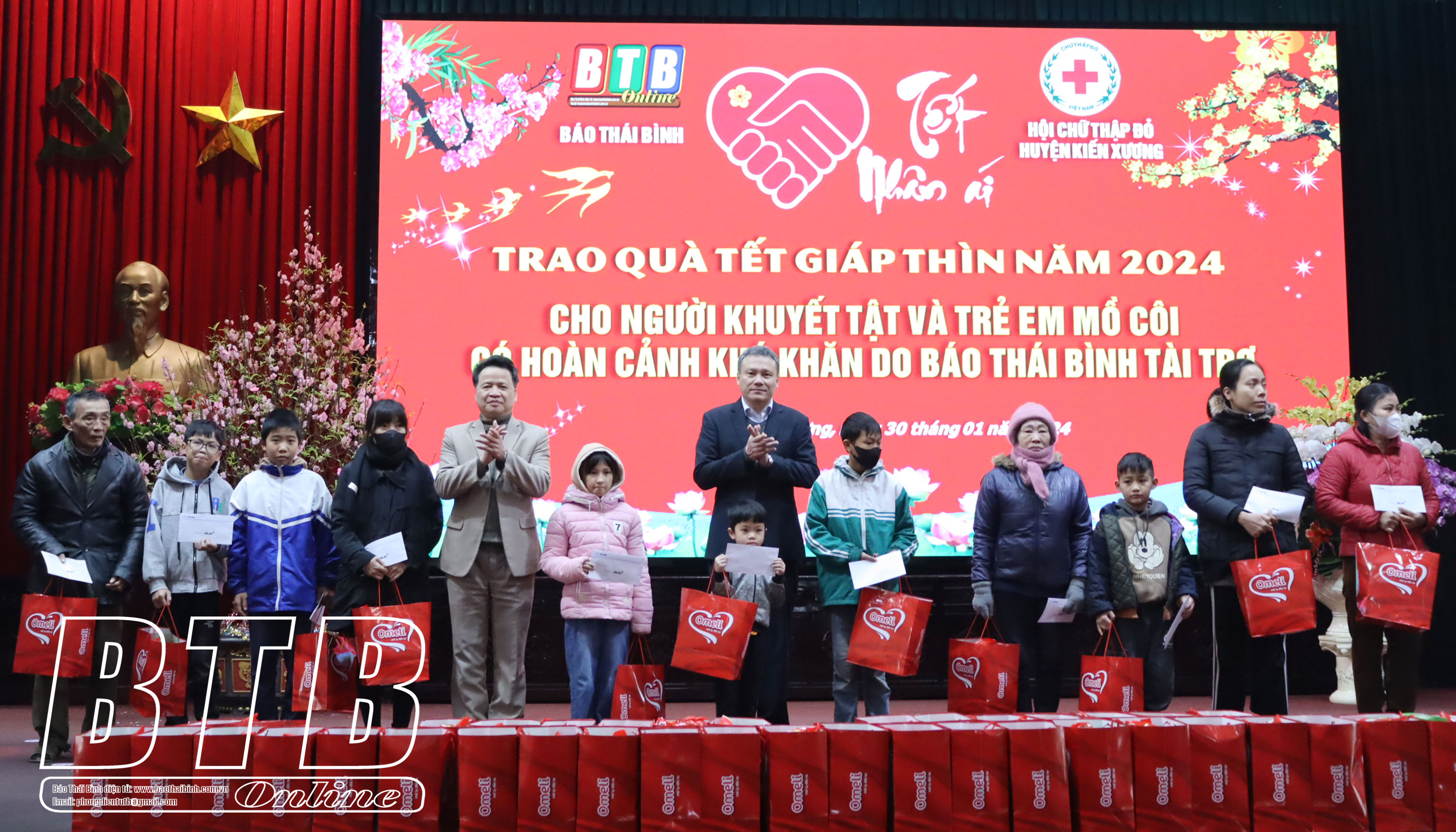 50 suất quà tết đã được lãnh đạo Báo Thái Bình, Huyện ủy Kiến Xương, Hội Chữ thập đỏ huyện trao cho người khuyết tật, trẻ em mồ côi có hoàn cảnh khó khăn của 12 xã, thị trấn và 2 trường học trên địa bàn huyện.