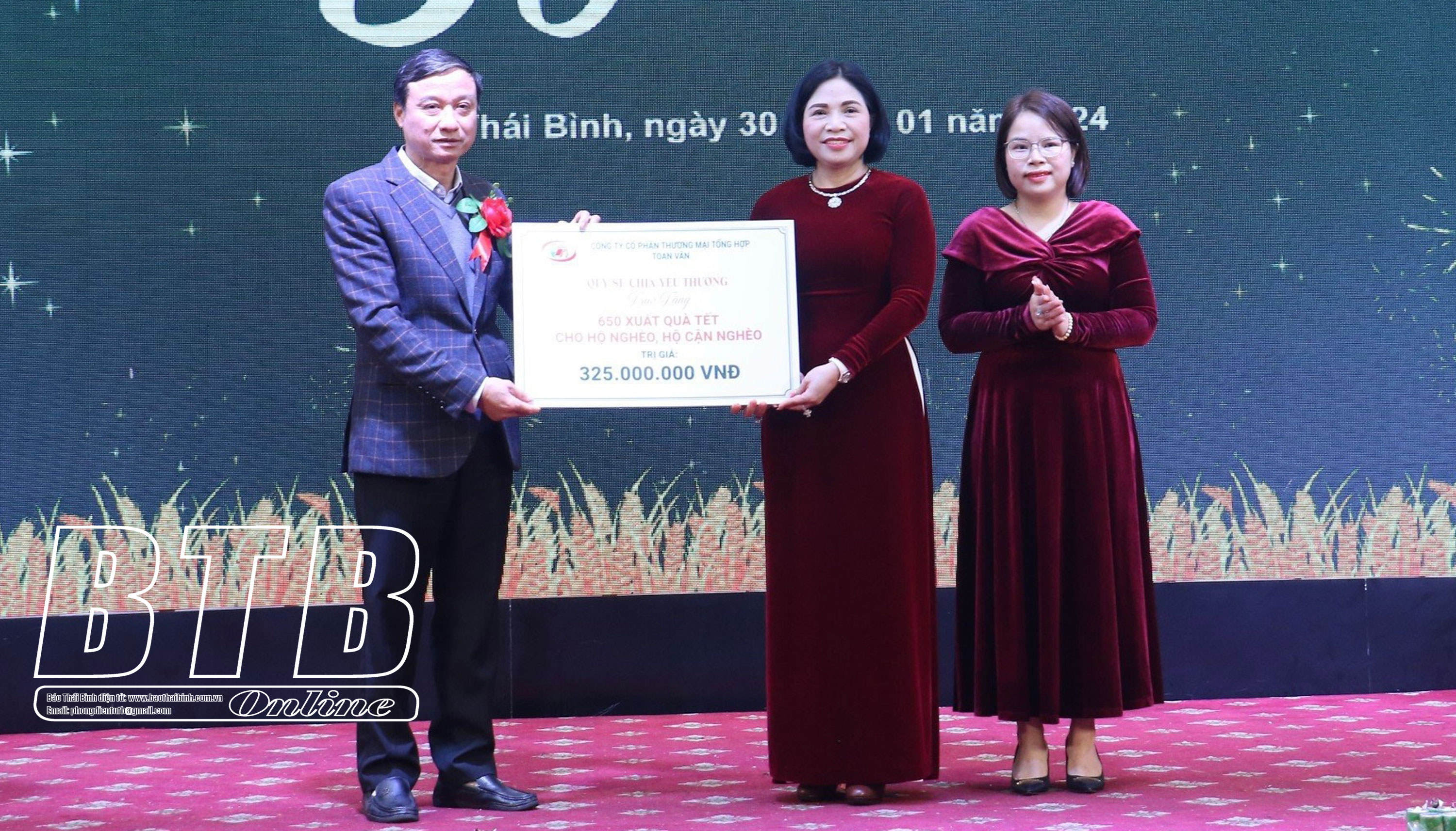 Cũng nhân dịp này, Công ty Cổ phần Thương mại tổng hợp Toan Vân đã trao 650 suất quà cho các hộ nghèo, hộ cận nghèo trên địa bàn tỉnh nhân dịp tết Nguyên đán Giáp Thìn 2024.