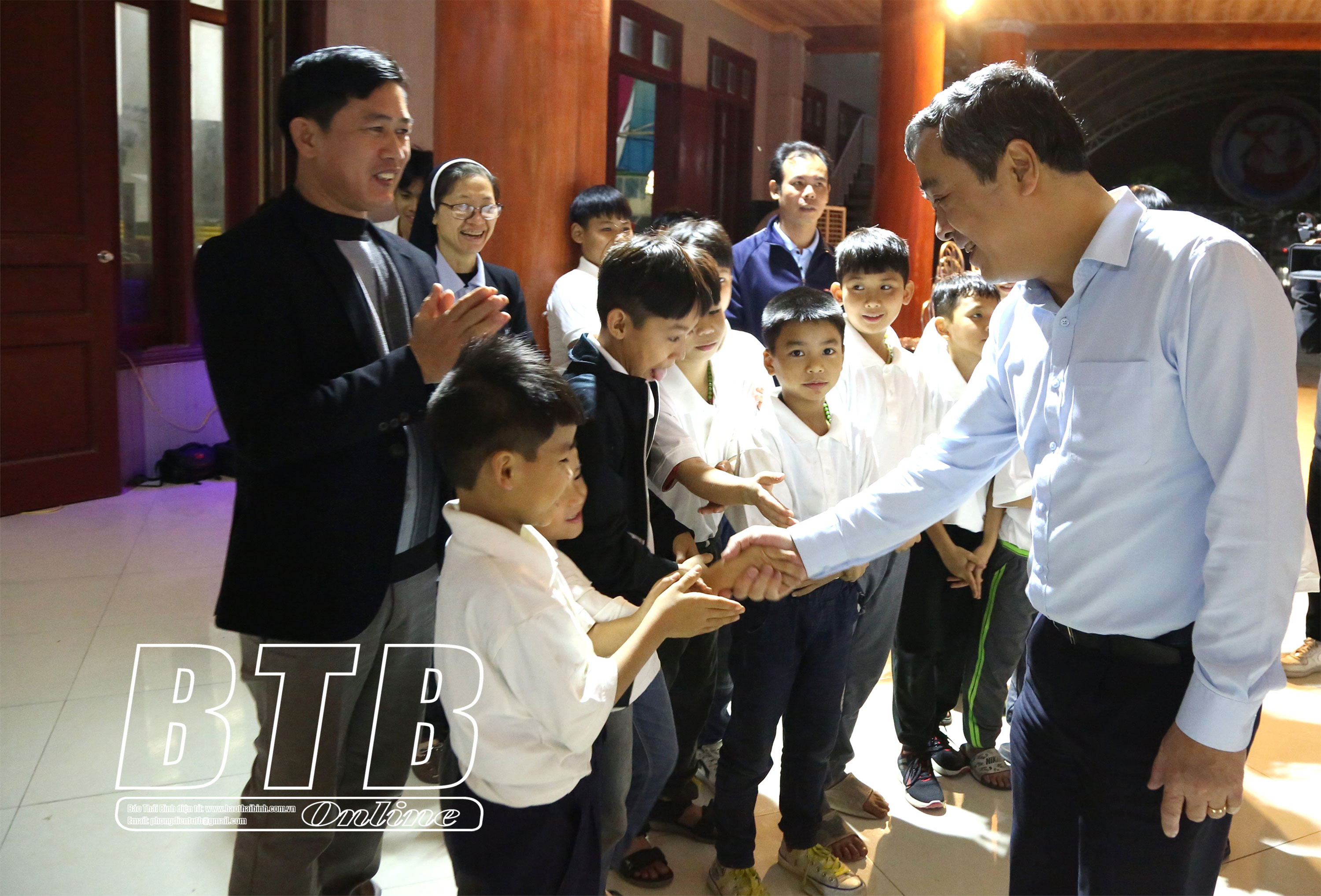 Trẻ em tại Trung tâm Mục vụ Giáo phận Thái Bình đón chào các đồng chí lãnh đạo tỉnh.