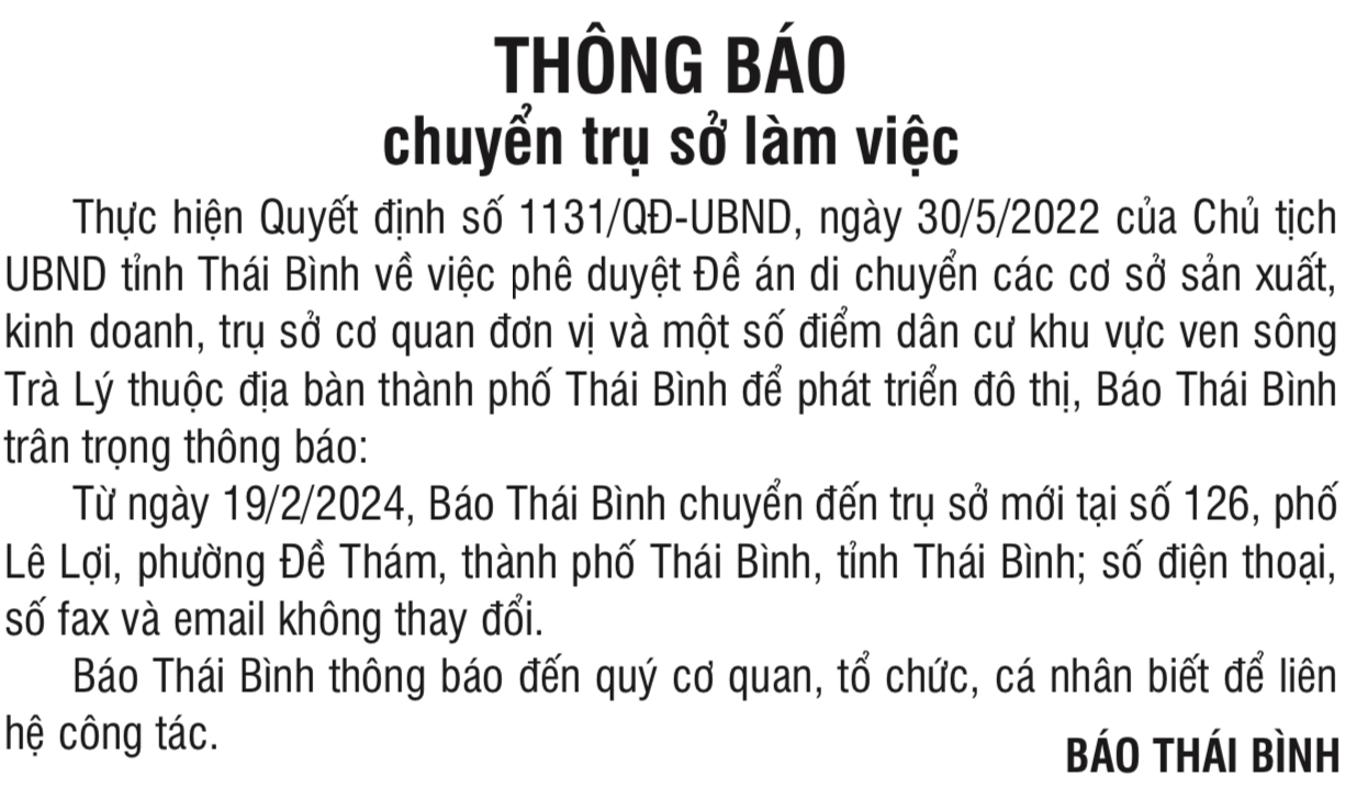 Báo Thái Bình: thông báo chuyển trụ sở làm việc
