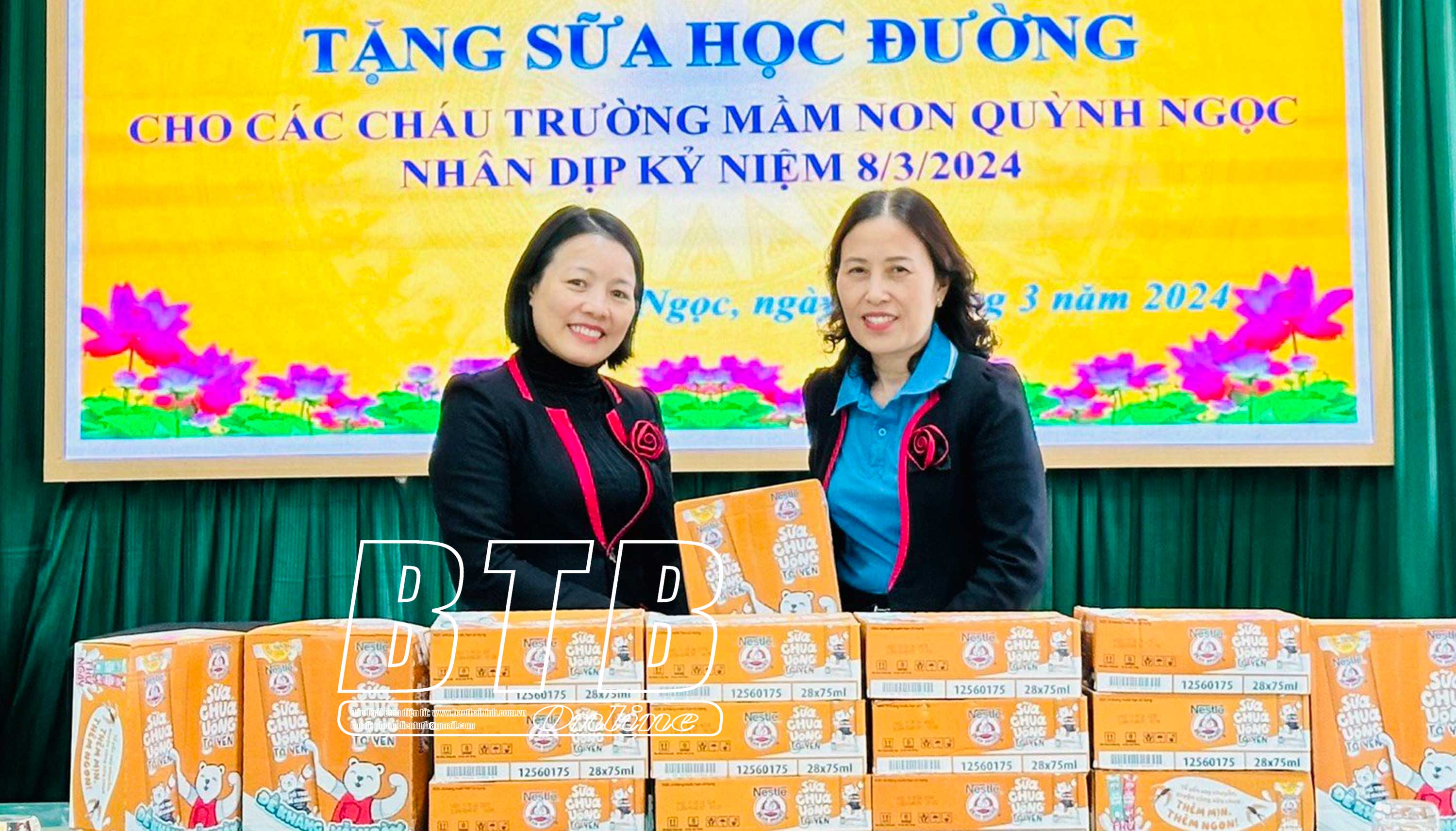 Chị Vũ Thị Nguyên (bên phải) tặng sữa cho các cháu Trường Mầm non Quỳnh Ngọc.