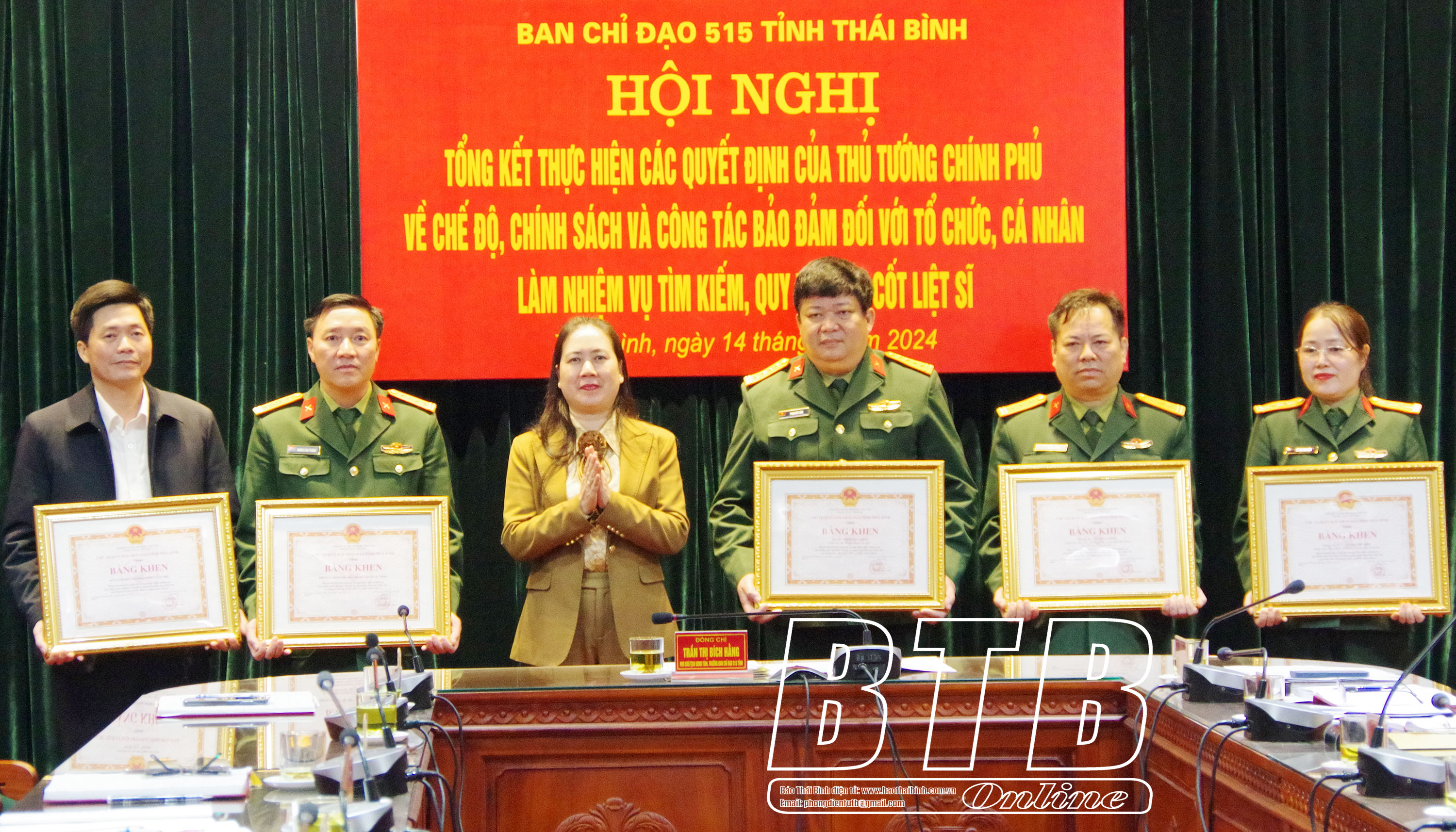 Đồng chí Trần Thị Bích Hằng, Tỉnh ủy viên, Phó Chủ tịch UBND tỉnh, Trưởng Ban chỉ đạo 515 của tỉnh trao bằng khen của Chủ tịch UBND tỉnh cho các tập thể, cá nhân.