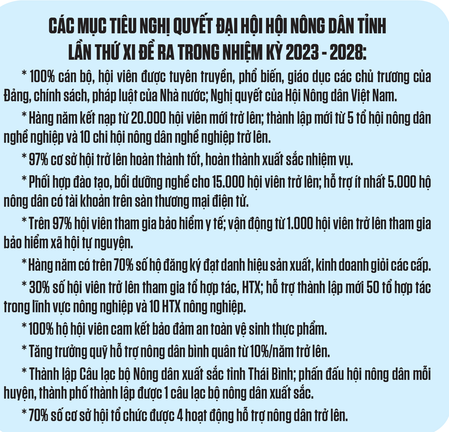 Ông Nguyễn Đình Chung, Chủ tịch Hội Nông dân huyện Thái Thụy cho biết: Sau Đại hội Hội Nông dân tỉnh, Hội Nông dân huyện đã tập trung tuyên truyền sâu rộng đến toàn thể cán bộ, hội viên nông dân hiểu được ý nghĩa và tầm quan trọng của Nghị quyết Đại hội. Để hoàn thành các mục tiêu đã đề ra, Hội Nông dân huyện chú trọng đổi mới phương thức hoạt động, hướng về cơ sở hỗ trợ hội viên, nông dân phát triển kinh tế, vươn lên làm giàu chính đáng. Trong đó, chú trọng khai thác tốt tiềm năng, lợi thế huyện ven biển và Khu kinh tế Thái Bình; tổ chức tốt các phong trào thi đua, đặc biệt là phong trào “Nông dân thi đua sản xuất, kinh doanh giỏi, đoàn kết giúp nhau xóa đói, giảm nghèo và làm giàu chính đáng”, nâng cao hiệu quả hoạt động tín dụng, hỗ trợ vốn cho hội viên phát triển sản xuất, kinh doanh, nâng cao thu nhập, cải thiện đời sống.
