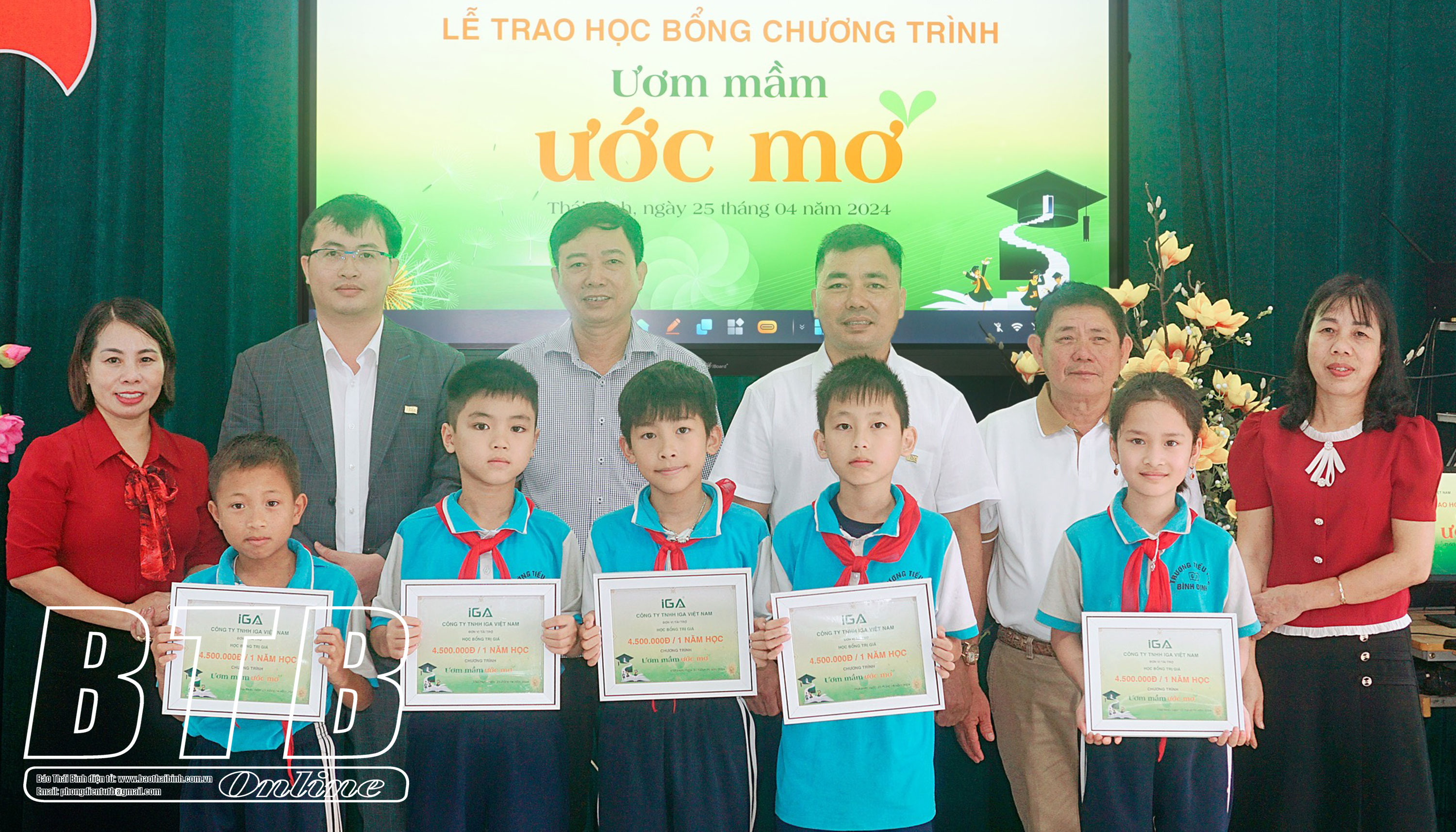 Đại diện Công ty đã trao 10 suất học bổng, mỗi suất trị giá 4,5 triệu đồng/năm học cho các em học sinh có hoàn cảnh đặc biệt khó khăn. Trước đó, ngày 25/4 Công ty TNHH IGA Việt Nam đã trao 31 suất học bổng với tổng trị giá 139,5 triệu đồng cho học sinh nghèo trường tiểu học và trung học cơ sở của các xã: Bình Định, Hồng Tiến, Minh Tân (Kiến Xương).