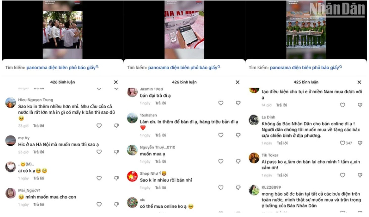 “5.000 bản thật sự quá ít, 50.000 bản còn hết”; “Mình tăng lên 1 triệu bản đi ạ, cho cháu mua tặng học sinh với Báo Nhân Dân ơi”; “Báo Nhân Dân cho bán online đi ạ! Người dân chúng tôi muốn mua về tặng các bác cựu chiến binh ở địa phương”,… Đây là vài trong số hàng nghìn bình luận của bạn đọc trên TikTok bày tỏ muốn có tờ Báo Nhân Dân đặc biệt ngày 7/5/2024.