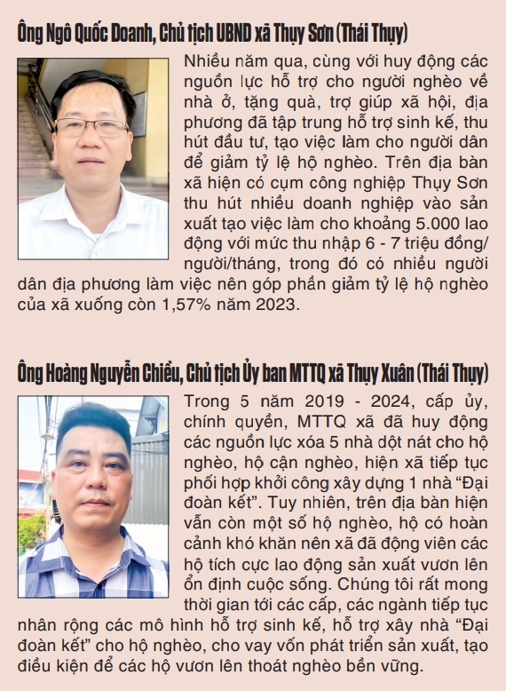 Nhờ thực hiện tốt phong trào thi đua gắn với chương trình mục tiêu quốc gia giảm nghèo bền vững, đến cuối năm 2023 tỷ lệ hộ nghèo của huyện Thái Thụy còn 1,93%, giảm 0,31%; tỷ lệ hộ cận nghèo còn 1,52%, giảm 0,44% so với năm 2022. Phát huy kết quả đạt được, thời gian tới, huyện Thái Thụy tiếp tục thực hiện hiệu quả phong trào thi đua “Vì người nghèo - không để ai bị bỏ lại phía sau”. Trong đó, Huyện ủy, UBND huyện chỉ đạo Ủy ban MTTQ huyện cùng các tổ chức thành viên, cấp ủy, chính quyền các xã, thị trấn tăng cường giúp đỡ hộ nghèo, tạo điều kiện và động viên, khuyến khích các hộ tích cực sản xuất, vươn lên thoát nghèo. Đồng thời, tập trung nguồn lực đầu tư cho chương trình giảm nghèo bền vững; ưu tiên hỗ trợ, hướng dẫn những hộ đăng ký thoát nghèo phát triển sản xuất, có việc làm, thu nhập ổn định.