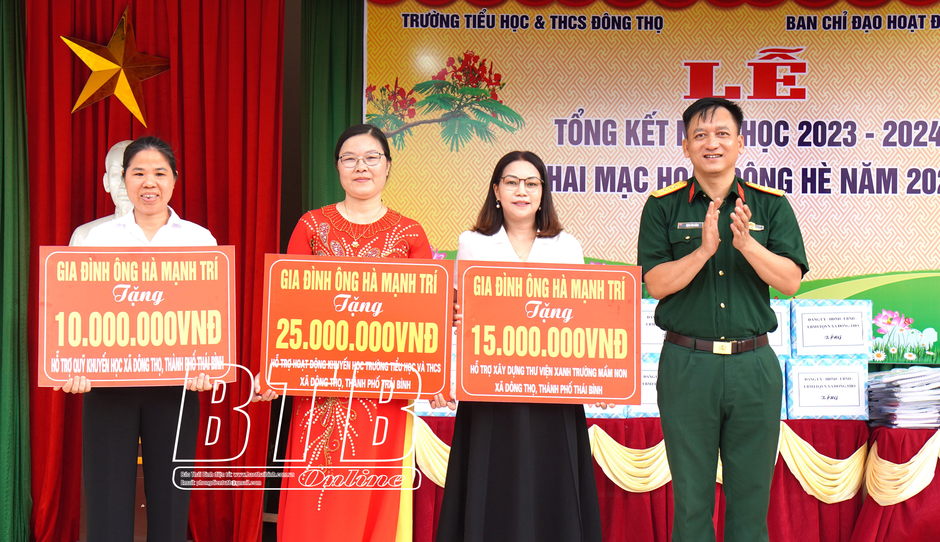 Gia đình ông Hà Mạnh Trí, người con xã Đông Thọ hiện đang sinh sống tại thành phố Hà Nội đã trao tặng địa phương 50 triệu đồng, trong đó có 10 triệu đồng hỗ trợ quỹ khuyến học của xã, 25 triệu đồng hỗ trợ hoạt động khuyến học của Trường Tiểu học và THCS Đông Thọ, 15 triệu đồng hỗ trợ xây dựng thư viện xanh Trường Mầm non Đông Thọ. Từ nguồn kinh phí này, Trường Tiểu học và THCS Đông Thọ đã trao tặng 15 xe đạp cho học sinh nghèo vượt khó và trao các phần quà biểu dương học sinh, cán bộ quản lý, giáo viên nhà trường có thành tích xuất sắc trong năm học 2023 - 2024. Ngoài ra, ông Phạm Thế Hùng, Công ty TNHH Thực hành giáo dục một thành viên Hùng Thuận (thành phố Thái Bình) hỗ trợ Trường Mầm non Đông Thọ 10 triệu đồng. Từ sự hỗ trợ của các mạnh thường quân, hiện nay Trường Mầm non Đông Thọ đã hoàn thiện xây dựng và đi vào hoạt động thư viện xanh với nhiều đầu sách bổ ích, phù hợp lứa tuổi học sinh, thiết thực đáp ứng nhu cầu dạy và học tại nhà trường.