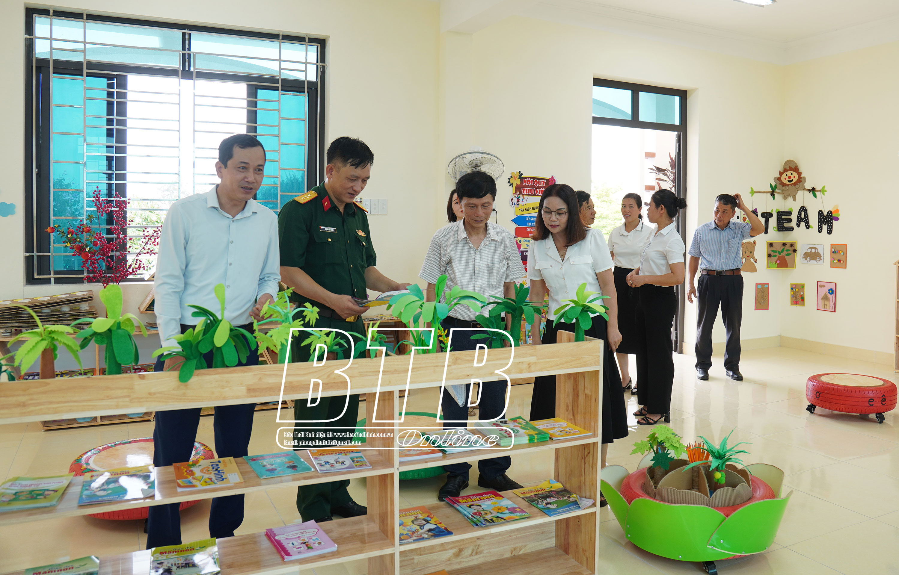 Đại diện nhà tài trợ, các đại biểu tham quan thư viện xanh tại Trường Mầm non Đông Thọ.