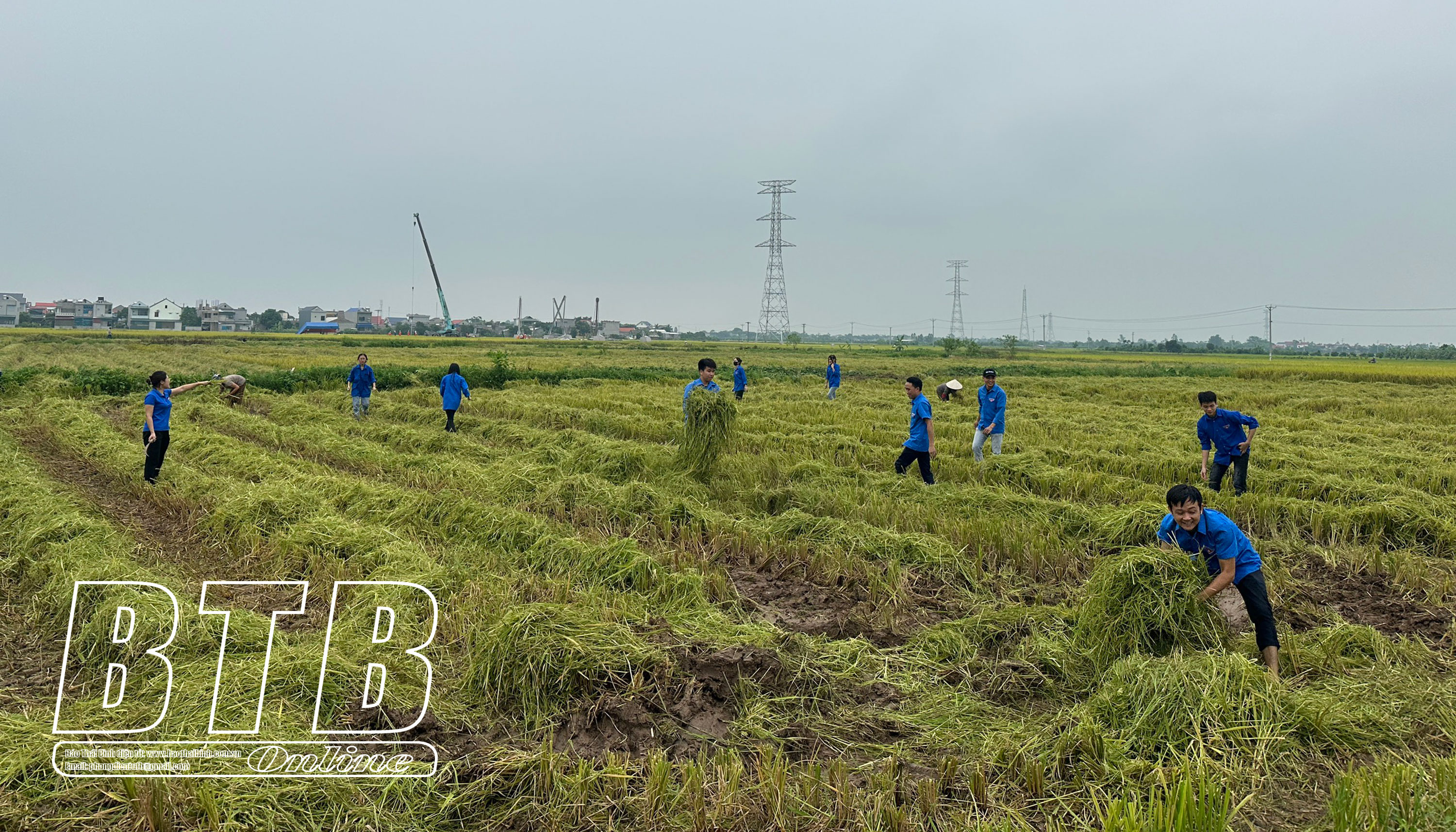Thanh niên tình nguyện hỗ trợ người dân gặt lúa nằm trong hành lang tuyến của đường dây 500kV mạch 3 tại xã Quỳnh Hoàng (Quỳnh Phụ).