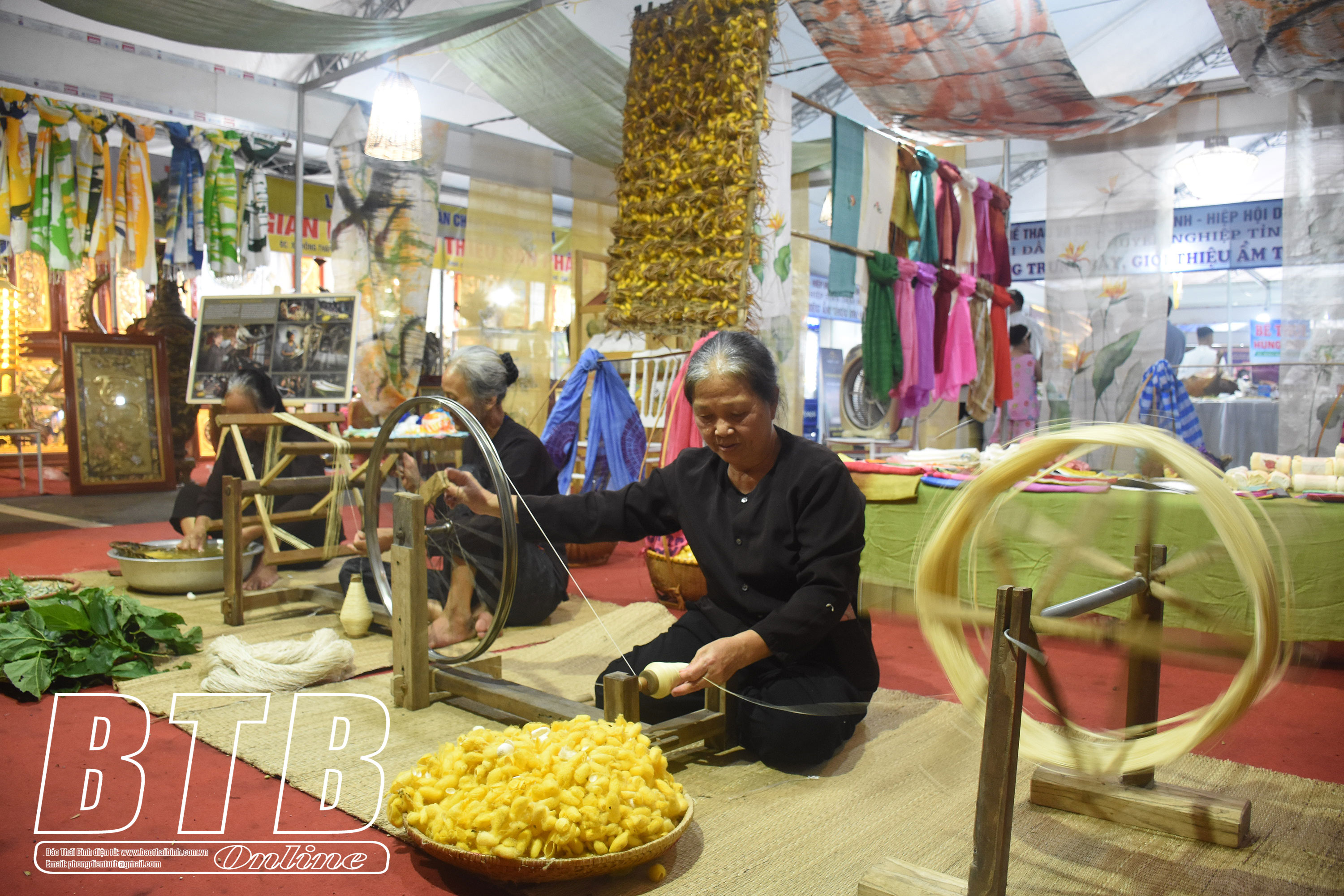 Sản phẩm dệt đũi cùa làng nghề dệt đũi xã Nam Cao (Kiến Xương) được các nghệ nhân thể hiện qua từng công đoạn và được trưng bày tại hội chợ.