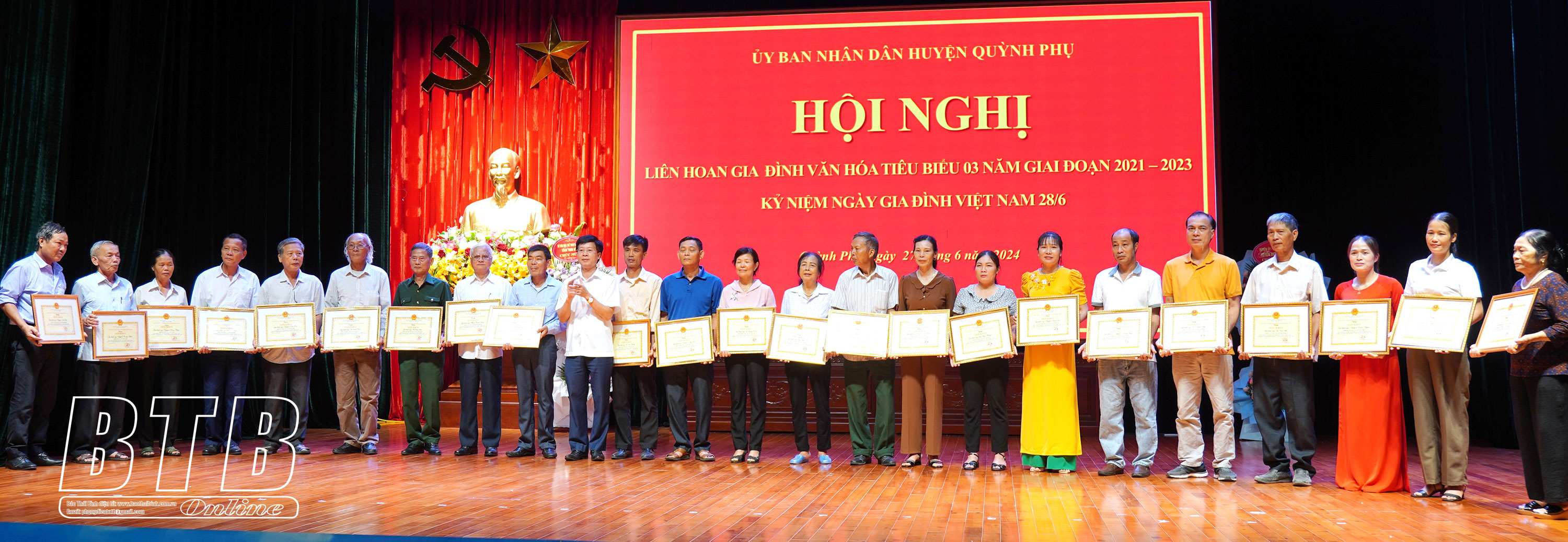 Tại hội nghị, UBND huyện đã vinh danh 74 gia đình văn hóa tiêu biểu đại diện cho gần 74.000 gia đình văn hóa trong toàn huyện. Các gia đình được tuyên dương, khen thưởng với thành tích xuất sắc trên các lĩnh vực: gia đình hiếu học, gia đình nền nếp gia phong, gia đình làm kinh tế giỏi, gia đình có đóng góp tích cực vì cộng đồng. Lãnh đạo Sở Văn hóa, Thể thao và Du lịch, UBND huyện Quỳnh Phụ đã trao giấy khen của Chủ tịch UBND huyện cho các gia đình văn hóa tiêu biểu.