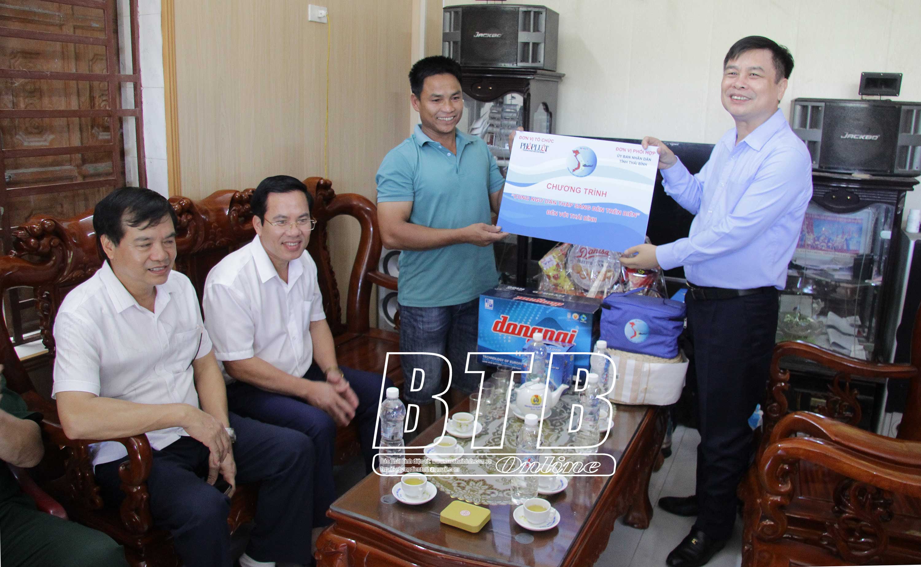 Đồng chí Phạm Văn Nghiêm, Tỉnh ủy viên, Phó Chủ tịch UBND tỉnh tặng quà  gia đình ngư dân xã Nam Thịnh (Tiền Hải).Đại diện Báo Pháp luật Thành phố Hồ Chí Minh tặng quà ngư dân xã Nam Thịnh (Tiền Hải).