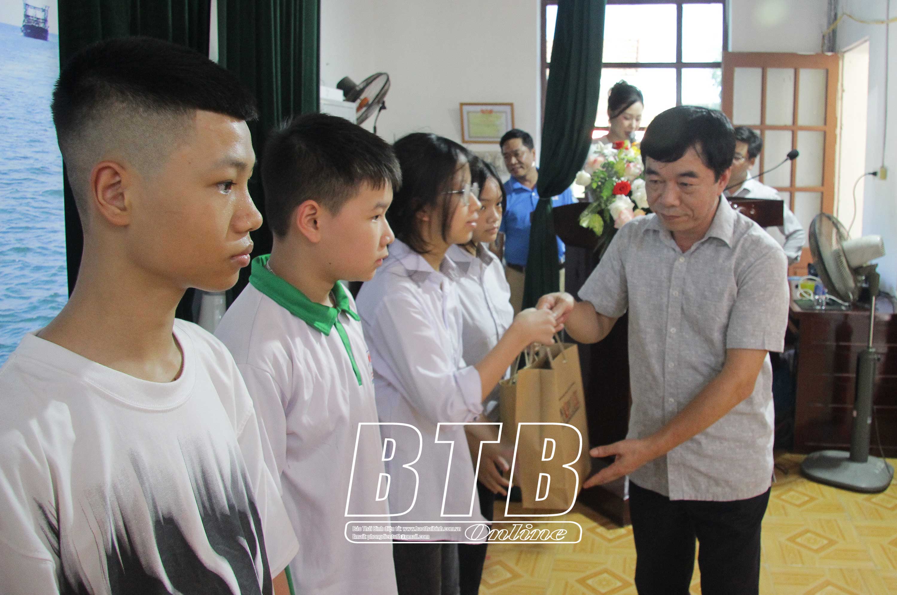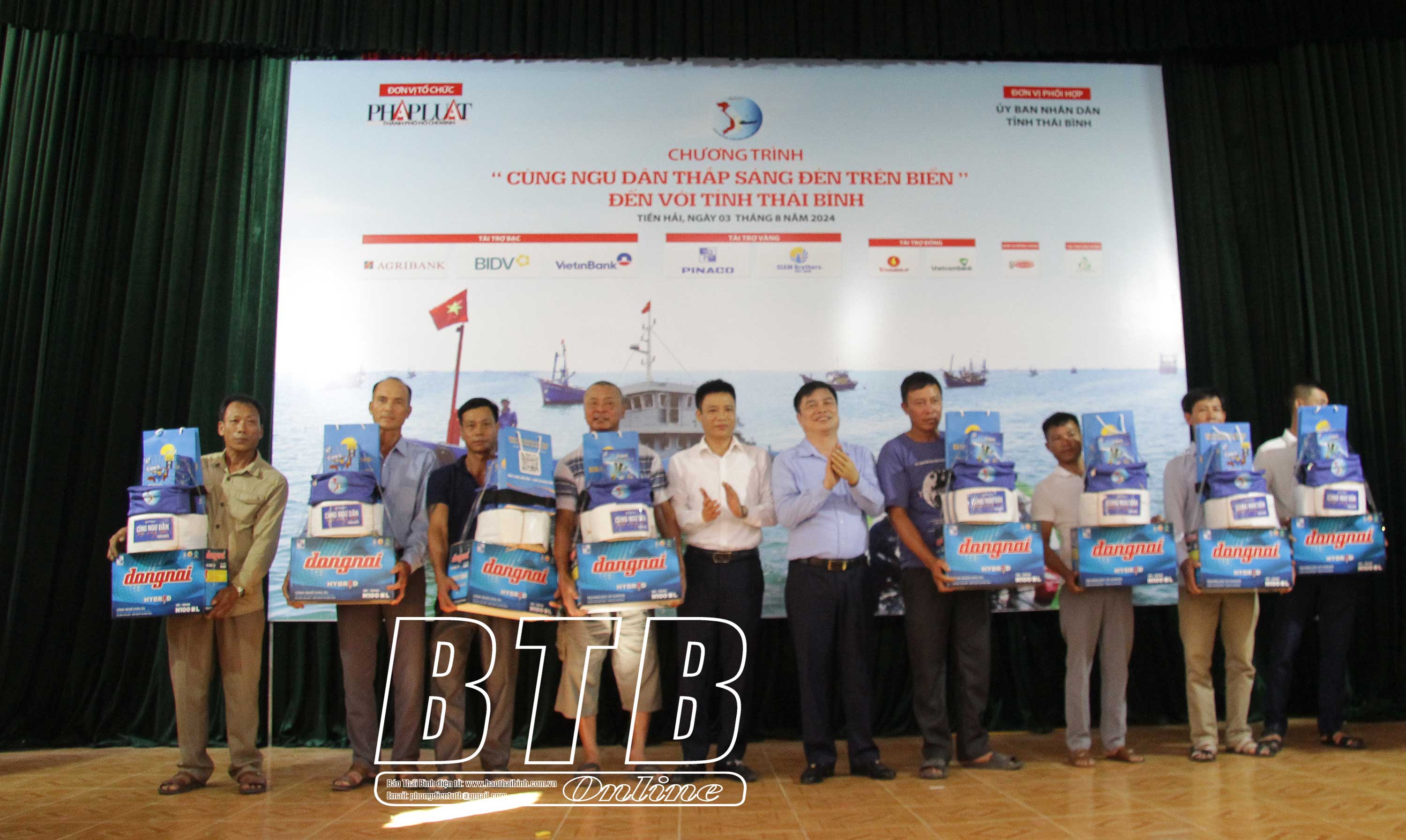 Đồng chí Phó Chủ tịch UBND tỉnh cùng đại diện Báo Pháp luật Thành phố Hồ Chí Minh đã trao tặng 200 phần quà cho ngư dân, mỗi phần quà trị giá hơn 5 triệu đồng, gồm: Bình acquy, bóng đèn, túi thuốc, hộp combo pin Con ó, cuộn dây thừng chuyên dụng, 1 cuốn cẩm nang “Những điều cần biết về đánh bắt hải sản”, phiếu mua hàng trị giá 1 triệu đồng và 25 suất học bổng, mỗi suất trị giá 2 triệu đồng cùng bộ dụng cụ học tập tặng các em học sinh hiếu học là con em của ngư dân huyện Tiền Hải, Thái Thụy.